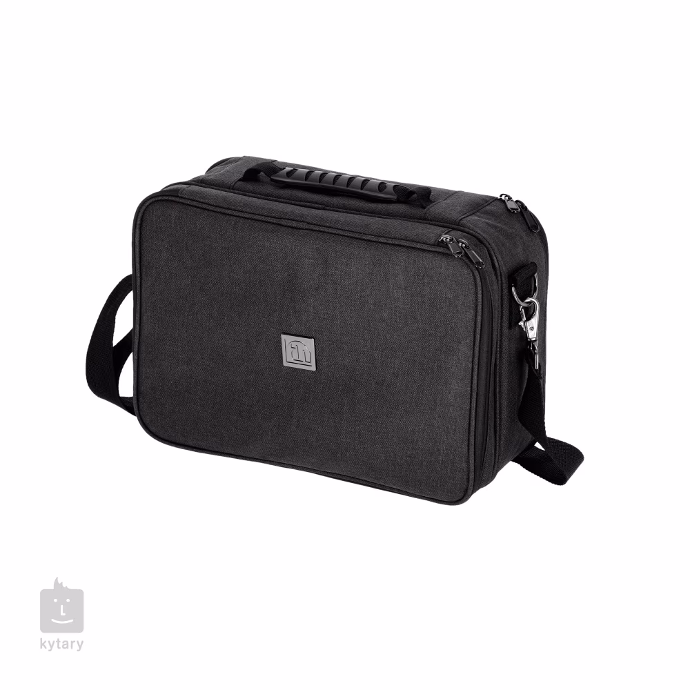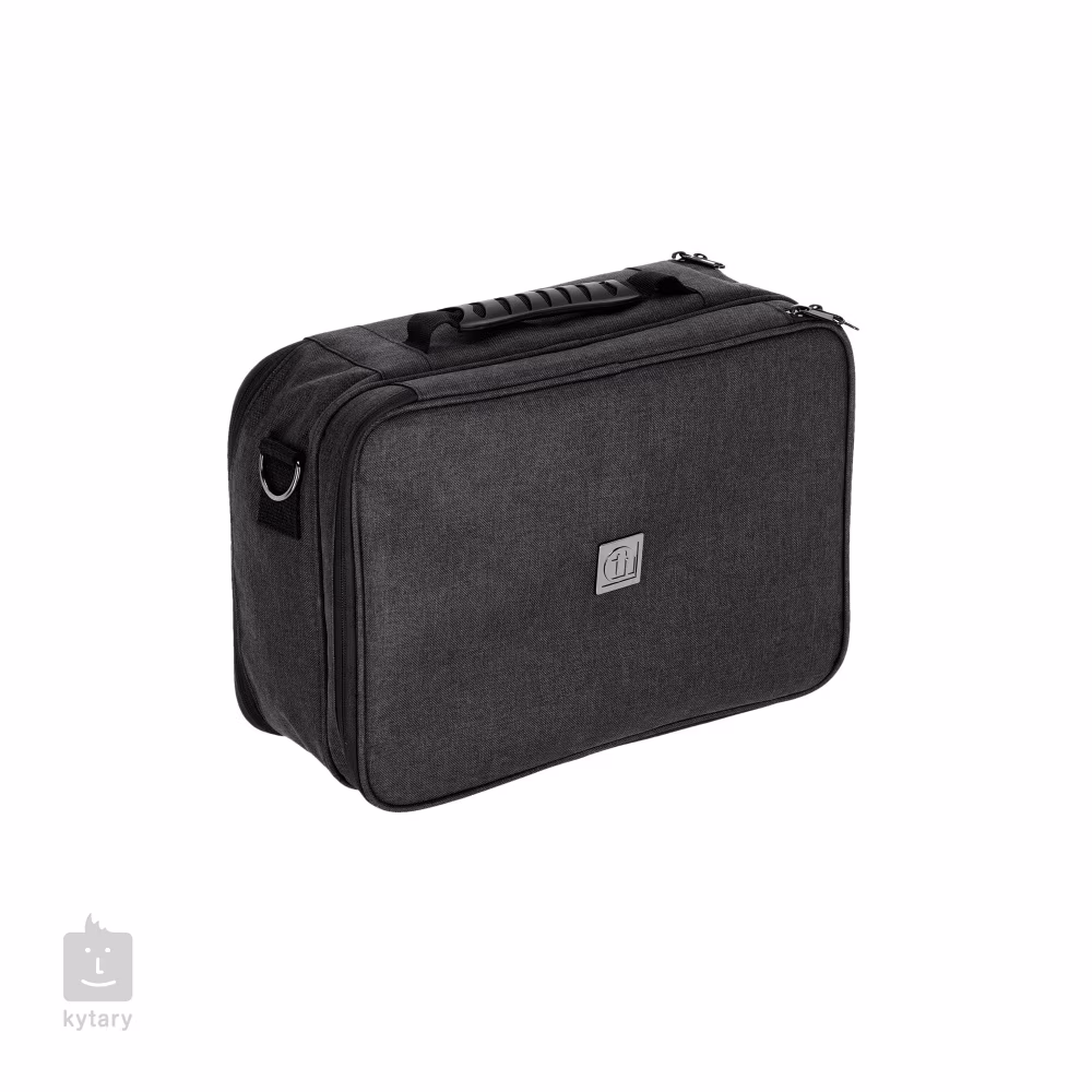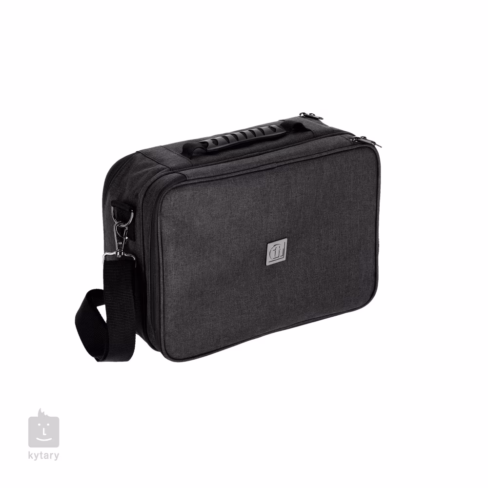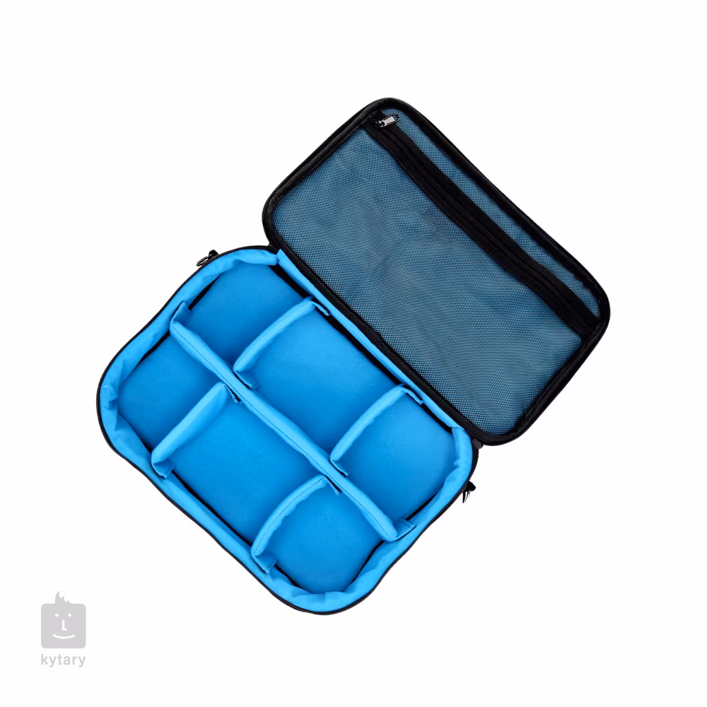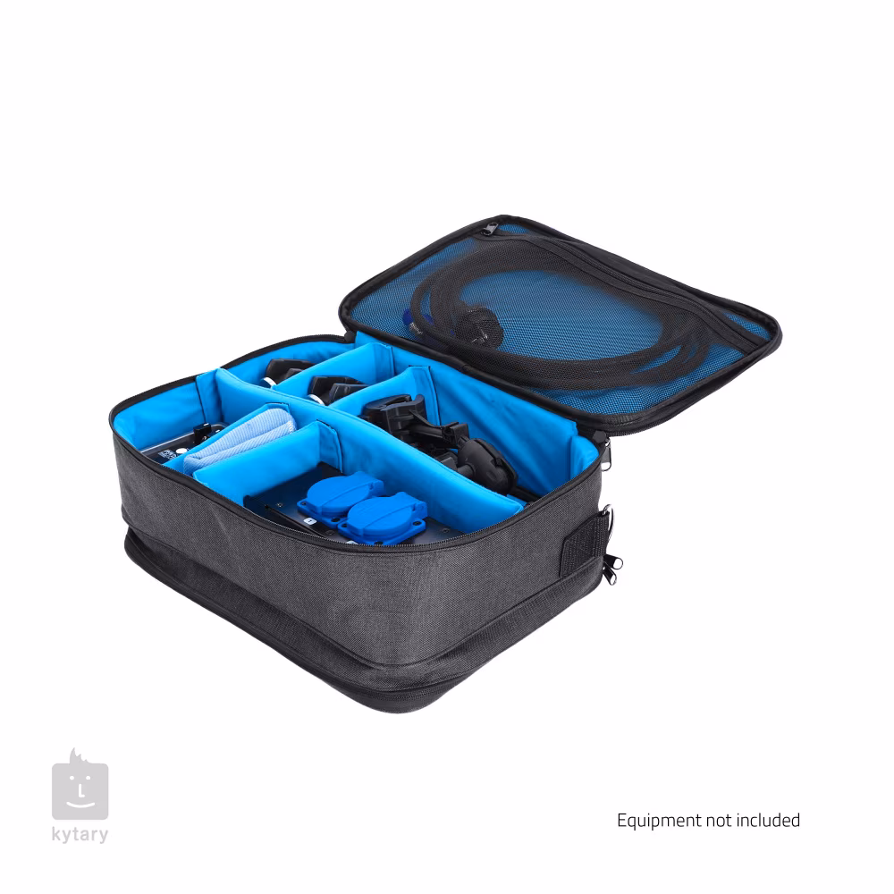 Transportkoffer, geeignet für Kabel, Mikrofone und anderes kleines Zubehör. Der Innenraum ist mit speziellen Taschen, Fächern und herausnehmbaren Wänden ausgestattet, die eine flexible Nutzung ermöglichen. Der ergonomisch geformte Handgriff und der Schultergurt sorgen für einen bequemen Transport.