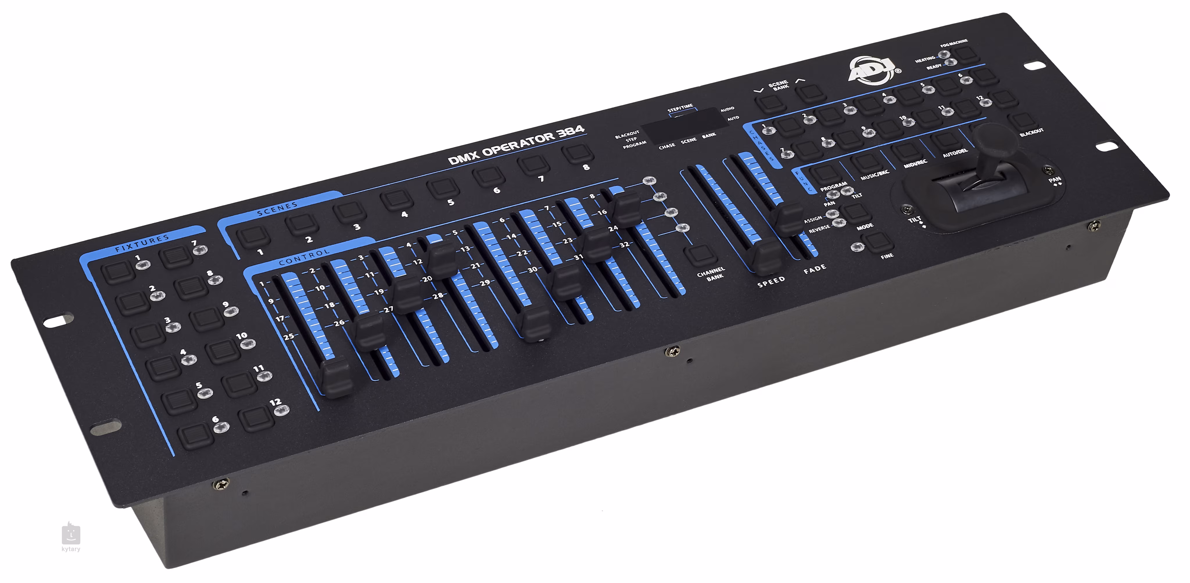 Der DMX Operator 384 von ADJ ist ein vielseitiger 19"-Rack-DMX- und MIDI-Controller, mit dem Sie bis zu 12 Geräte steuern und bis zu 32 Kanäle für jedes Gerät kontrollieren können. Insgesamt kann er bis zu 384 Kanäle verwalten. Darüber hinaus können Sie bis zu 240 Szenen programmieren und daraus Sequenzen oder Chases erstellen. Es gibt 8 Speicherbänke für Szenen (jeweils 30 Szenen) und 12 Sequenzen (jede Sequenz kann bis zu 240 Schritte enthalten).