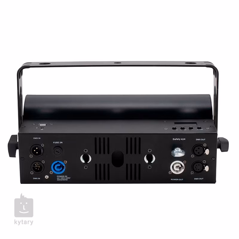 Auf der Rückseite befinden sich 3-polige und 5-polige DMX-Anschlüsse sowie PowerCon-Stromanschlüsse. An der Seite befinden sich das Bedienfeld und der USB-Anschluss für Firmware-Updates. Der Scheinwerfer kann mit der Metallhalterung oder der mitgelieferten Klemme an der Tragstruktur befestigt werden - bei Verwendung der Klemme können Sie die seitliche Halterung entfernen und ein weiteres Gerät an der Seite des Stroboskops anbringen, um den Lichtbereich nahtlos zu erweitern und dynamische Effekte hervorzuheben. Ein Netzkabel und ein Infrarot-Controller sind ebenfalls im Lieferumfang enthalten.