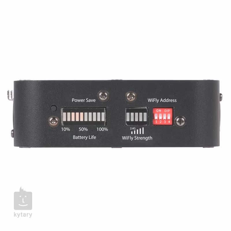 Die Batterie im Transceiver hält bis zu 20 Stunden. An der Seite des Geräts befinden sich digitale Anzeigen für den Batteriestatus und die WiFLY-Signalstärke. Eine Magnetplatte an der Unterseite ermöglicht die einfache, vorübergehende Befestigung des WiFLY EXR Battery Transceivers an metallischen Beleuchtungskörpern oder Objekten. Das kabellose Signal wird mit 2,4 GHz übertragen und funktioniert problemlos in Umgebungen mit starkem Funkverkehr neben Bluetooth- oder Wi-Fi-fähigen Geräten.