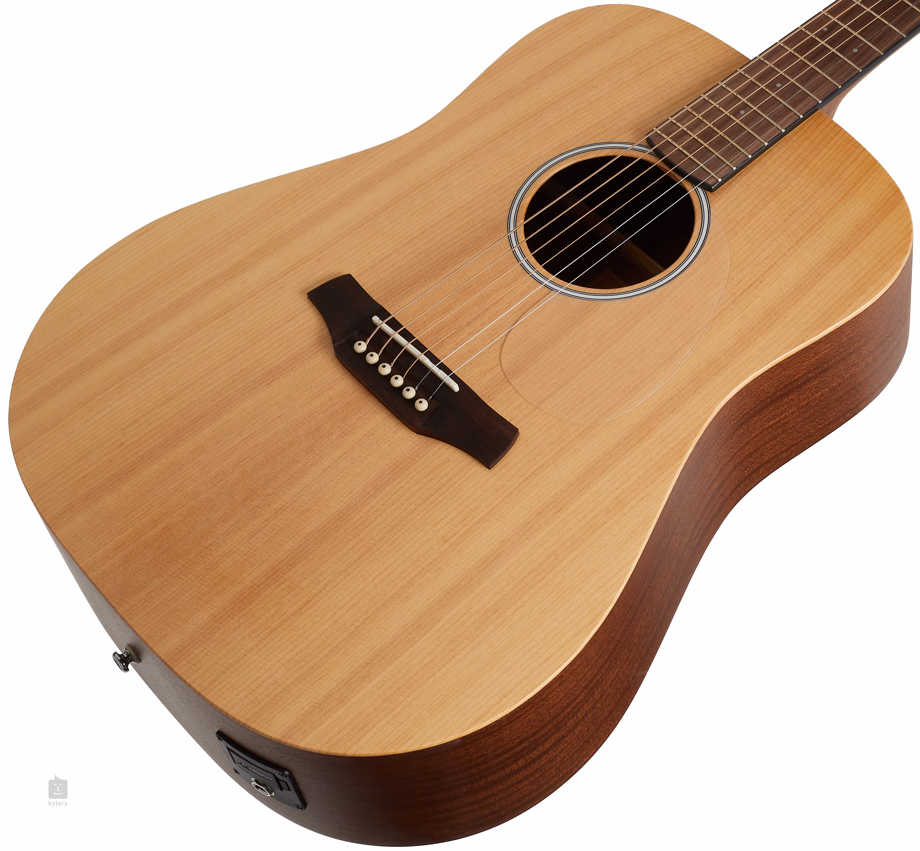 Die Fishman Presys II-Elektronik mit Lautstärkeregler, Zweiband-Equalizer, Phasenumkehrer und eingebautem Stimmgerät bietet die Möglichkeit der Verstärkung. Die Saiten sind über den Nulldurst und den Sattel aus Knochen in verchromten Die-Cast-Mechaniken und einem Steg aus Pau Ferro befestigt. Die schlichte, aber stilvolle Verarbeitung wird durch ein transparentes Schlagbrett und eine Rosette aus schwarzen und weißen Linien unterstrichen.