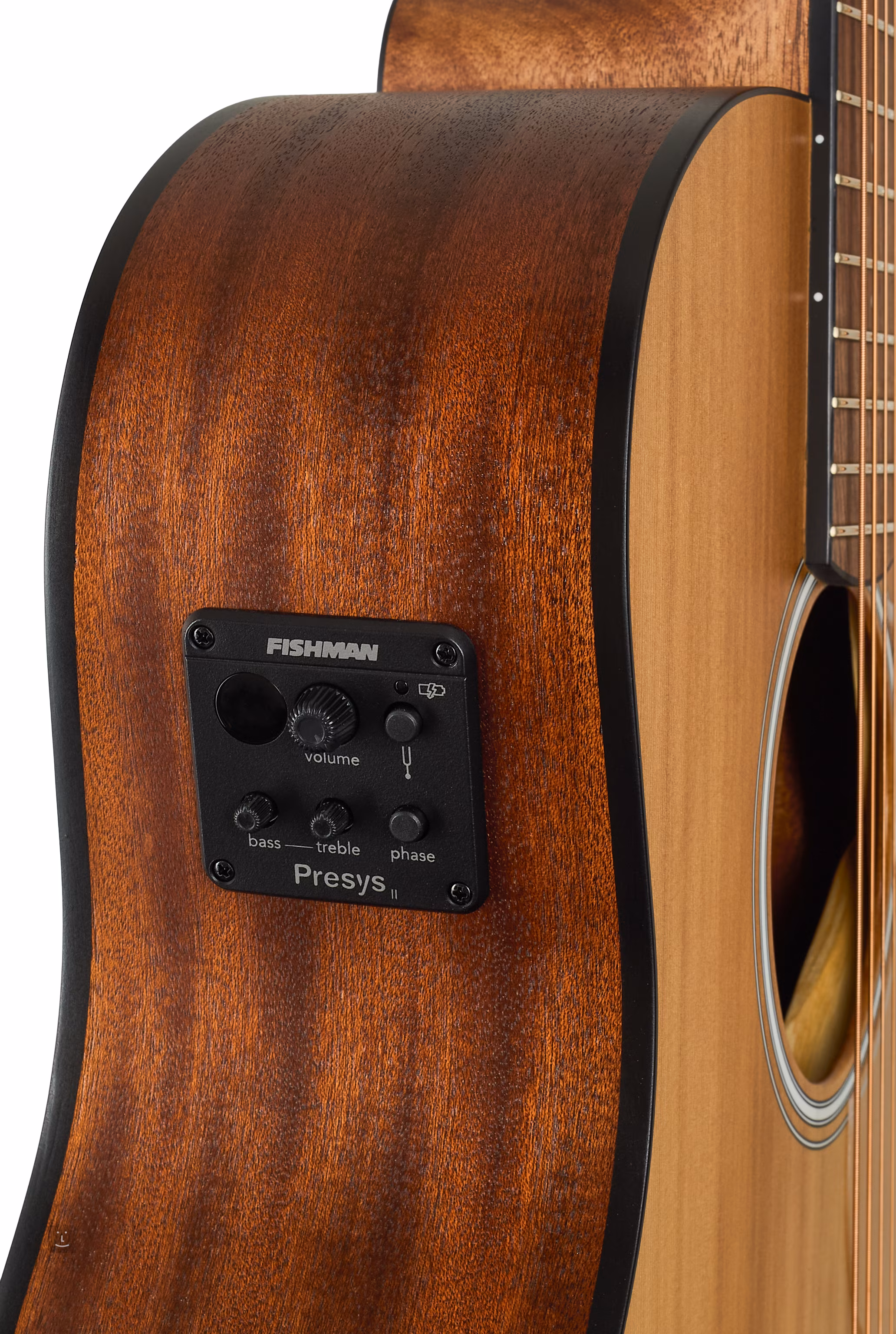 Die Fishman Presys II-Elektronik mit Lautstärkeregler, Zweiband-Equalizer, Phasenumkehrer und eingebautem Stimmgerät bietet die Möglichkeit der Verstärkung. Die Saiten werden über den Null- und Sattel-Bund aus Knochen in verchromten Die-Cast-Mechaniken und einem Steg aus Pau Ferro befestigt. Die schlichte, aber stilvolle Verarbeitung wird durch ein transparentes Schlagbrett, eine schwarze Einfassung des Korpus und eine Rosette aus schwarzen und weißen Linien unterstrichen.