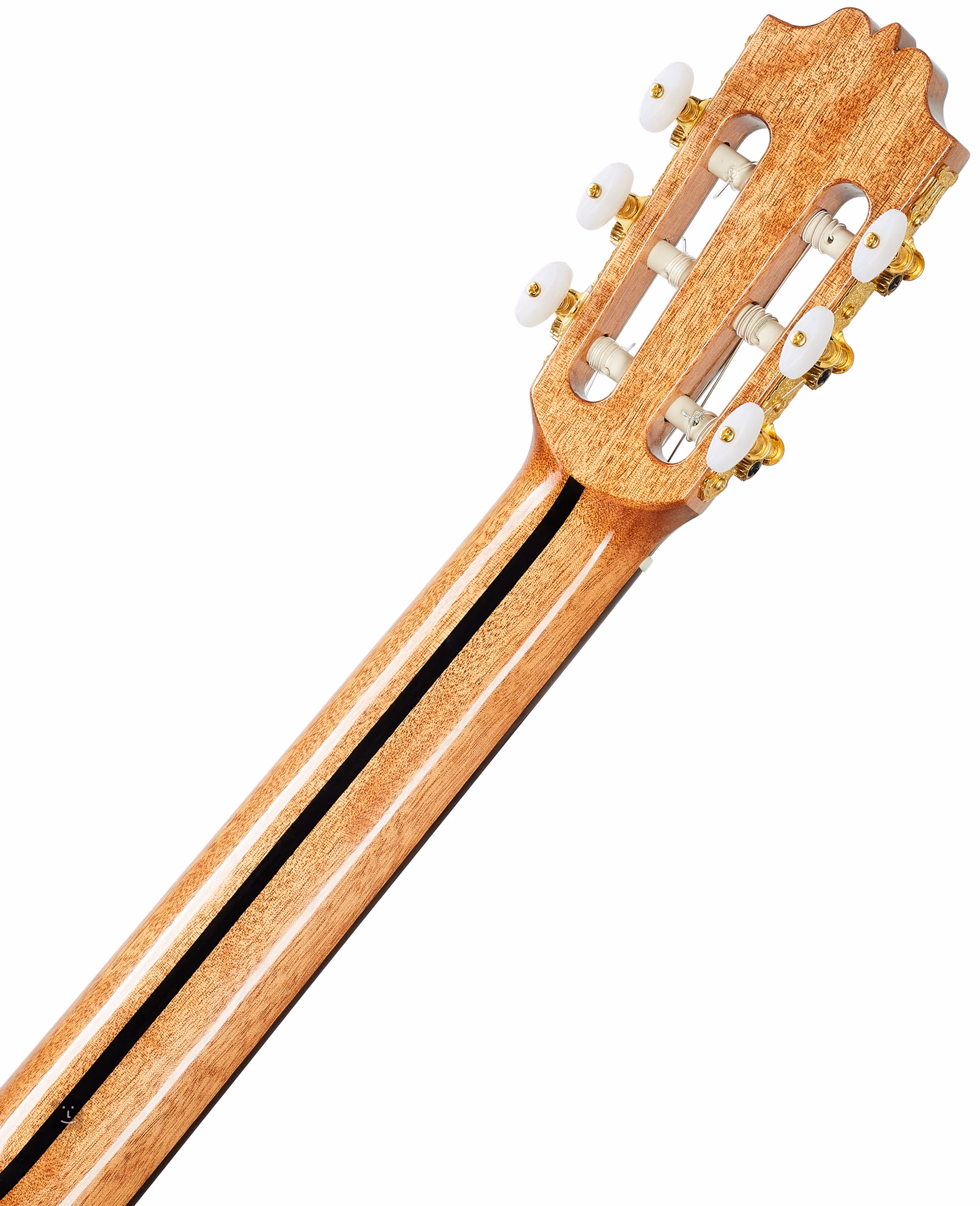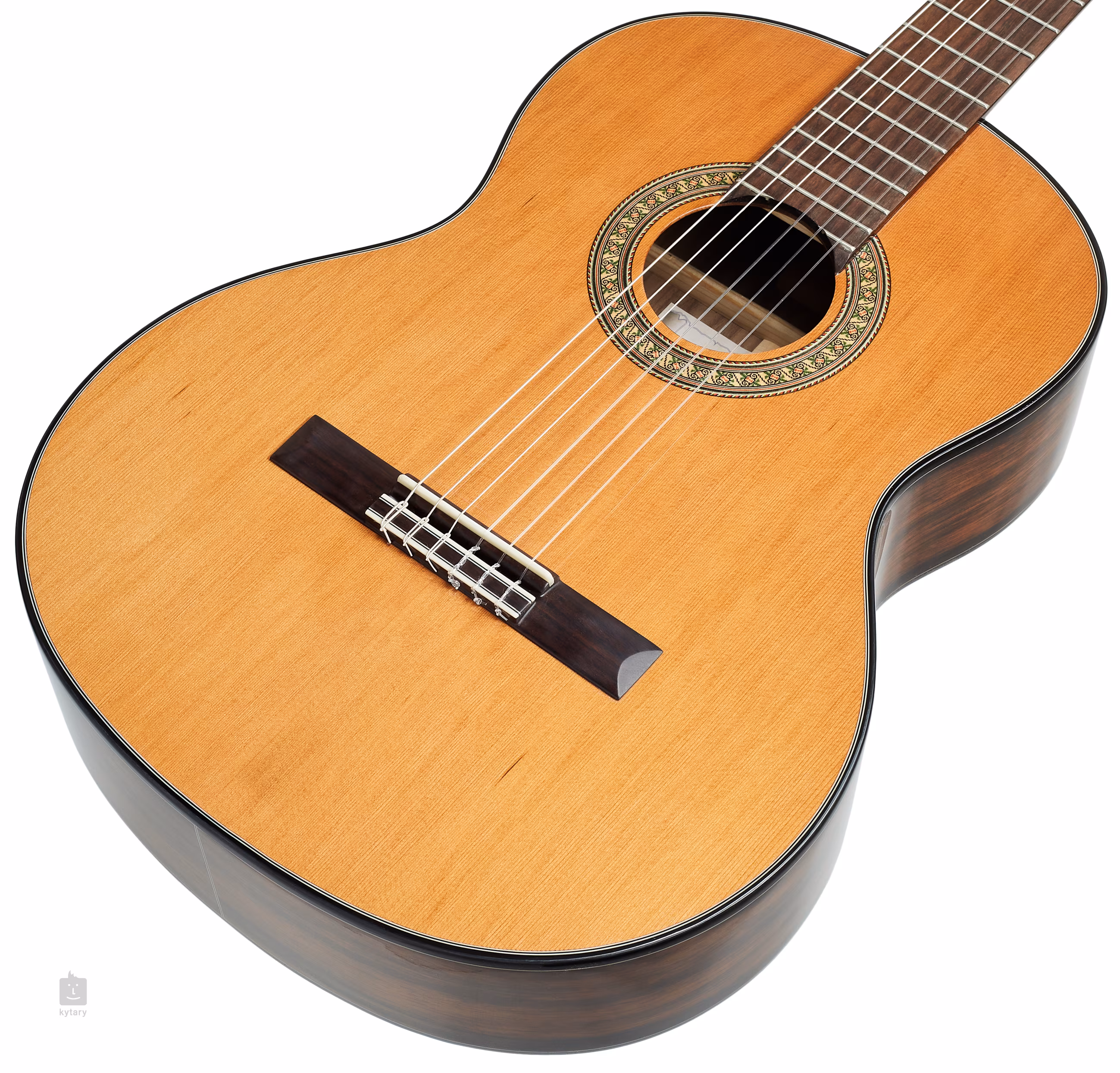 Die Admira ADM04 ist eine Konzertgitarre mit einer halbmassiven Konstruktion, die selbst erfahrene Musiker anspricht. Die Vorderseite der Gitarre ist aus massivem Zedernholz gefertigt, während Boden und Zargen aus optisch auffälligem, laminiertem Ebenholz hergestellt sind. Der Hals aus afrikanischem Mahagoni ist mit einer Ebenholzbeleistung versehen, während das Griffbrett und die Kopfplatte ebenfalls aus Ebenholz gefertigt sind. Eine gute Stimmung wird durch die Saitenaufhängung in hochwertiger klassischer Mechanik in Goldlackierung gewährleistet. Die stilvolle Verarbeitung wird durch traditionelle Elemente in Form einer Rosette, mehrschichtigen Holzleisten und dem Firmenlogo auf der Kopfplatte akzentuiert.