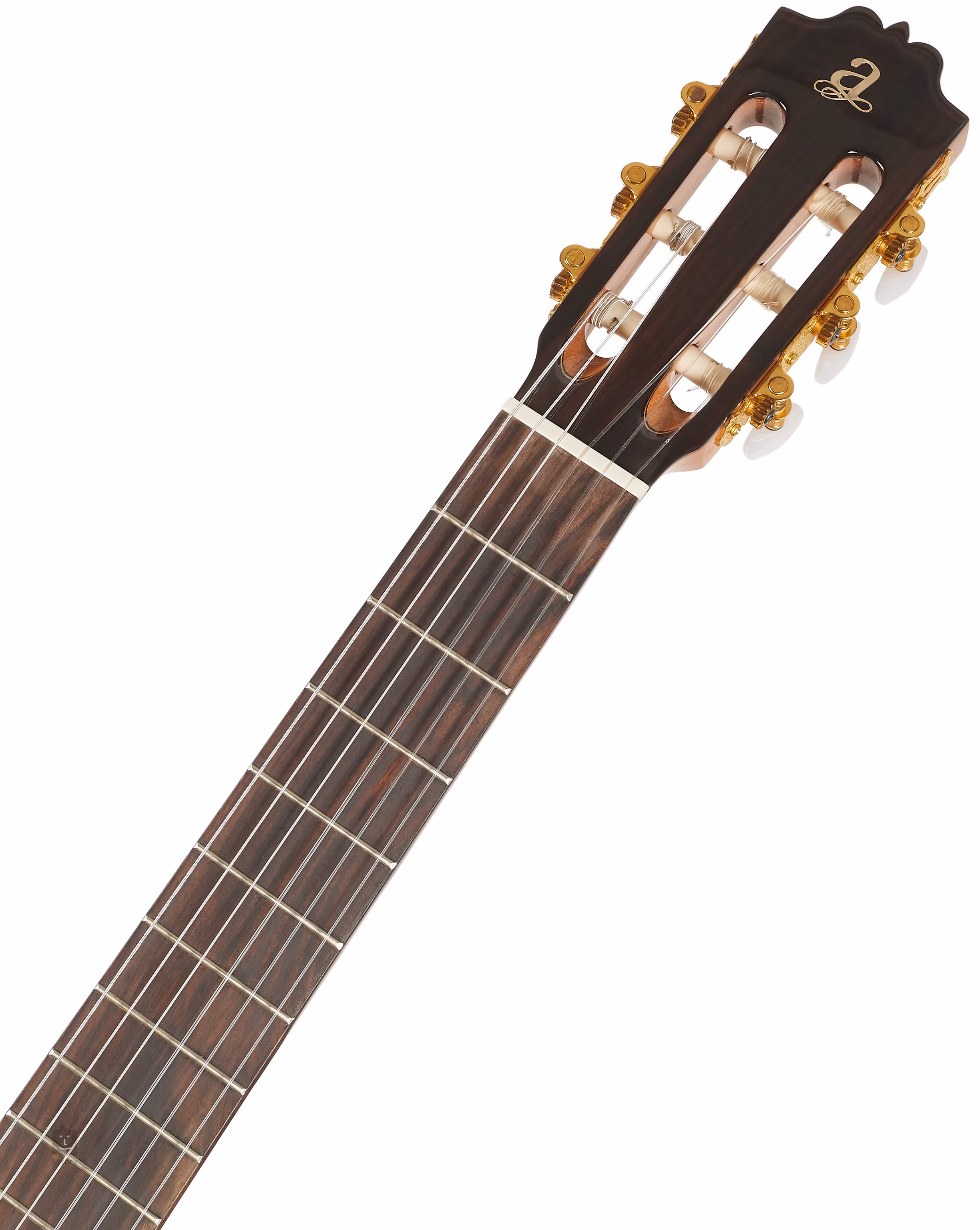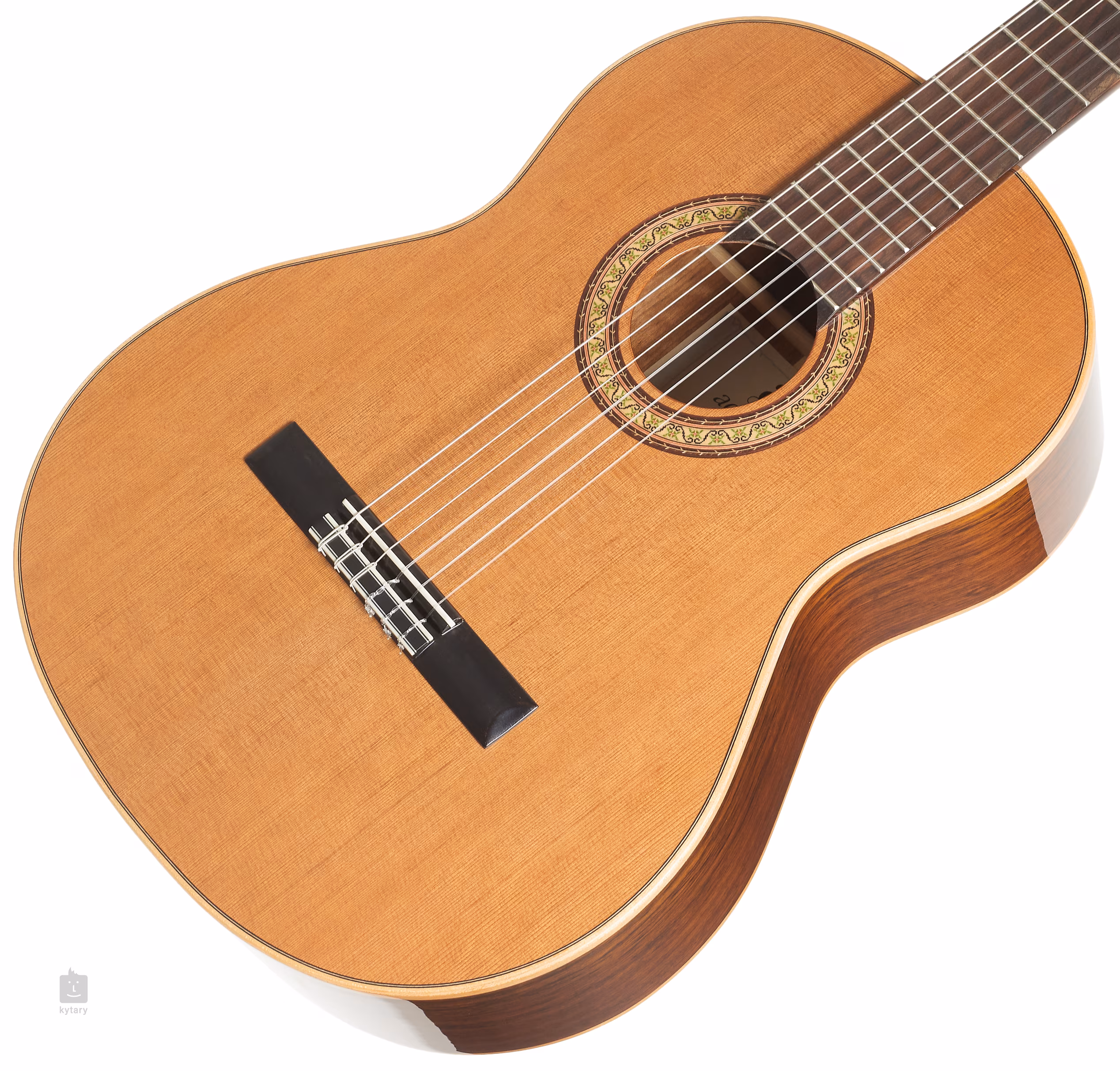 Die Admira ADM08-Klassikgitarre ist ein halbmassives, handgefertigtes Instrument, das auch den erfahrensten Musikern gefallen kann. Die Vorderseite der Gitarre ist aus massivem Zedernholz gefertigt, während Boden und Zargen aus laminiertem Palisanderholz bestehen. Der Hals aus afrikanischem Mahagoni ist mit einer Palisanderbeleistung versehen, und das Griffbrett ist aus Palisander. Für eine gute Stimmung sorgen die Saitenaufhängung in hochwertigen klassischen Goldmechaniken und ein Griffbrett aus Palisander. Die stilvolle Verarbeitung wird durch traditionelle Elemente in Form von Rosetten, Ahornzierleisten und dem Firmenlogo auf der Kopfplatte unterstrichen.