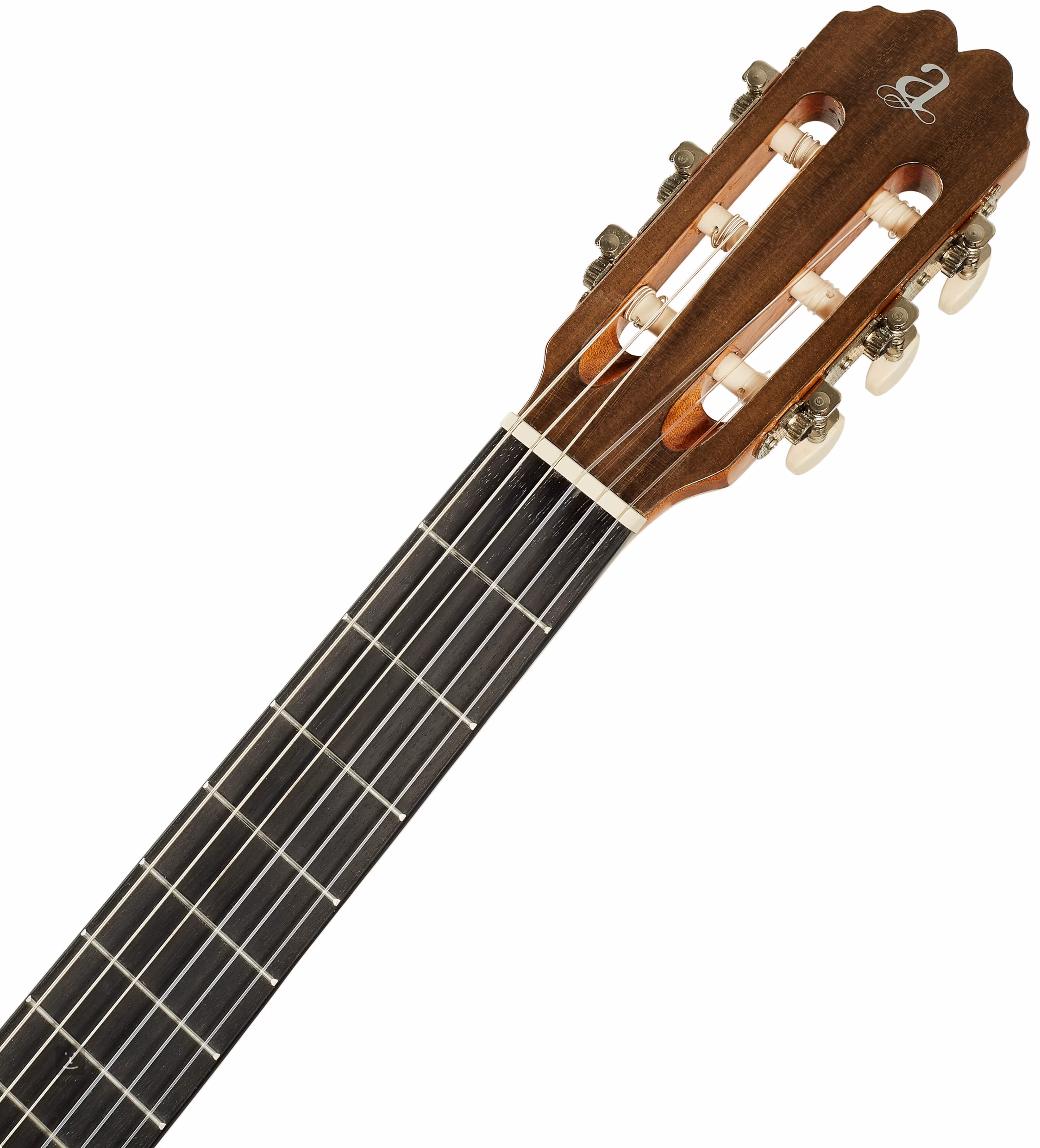 Die Admira ADMI0200 ist eine preisgünstige klassische Gitarre aus der Admira Alba-Serie, die sich für absolute Anfänger eignet. Die Decke der Gitarre besteht aus laminierter Fichte, der Boden und die Zargen sind aus laminiertem Sapeli gefertigt. Der Mahagonihals ist mit einem Griffbrett aus Kabukalli-Holz versehen. Die Saiten sind in klassischen Stimmmechaniken befestigt. Die stilvolle Verarbeitung wird durch traditionelle Elemente wie Rosette und Einfassung unterstrichen. Die spanische Marke Admira gehört zu den traditionellen Herstellern von klassischen und Flamenco-Gitarren. Die meisten Instrumente werden nach wie vor in einer Fabrik in Nordspanien hergestellt, wo erfahrene Gitarrenbauer für ihre Spitzenqualität sorgen.