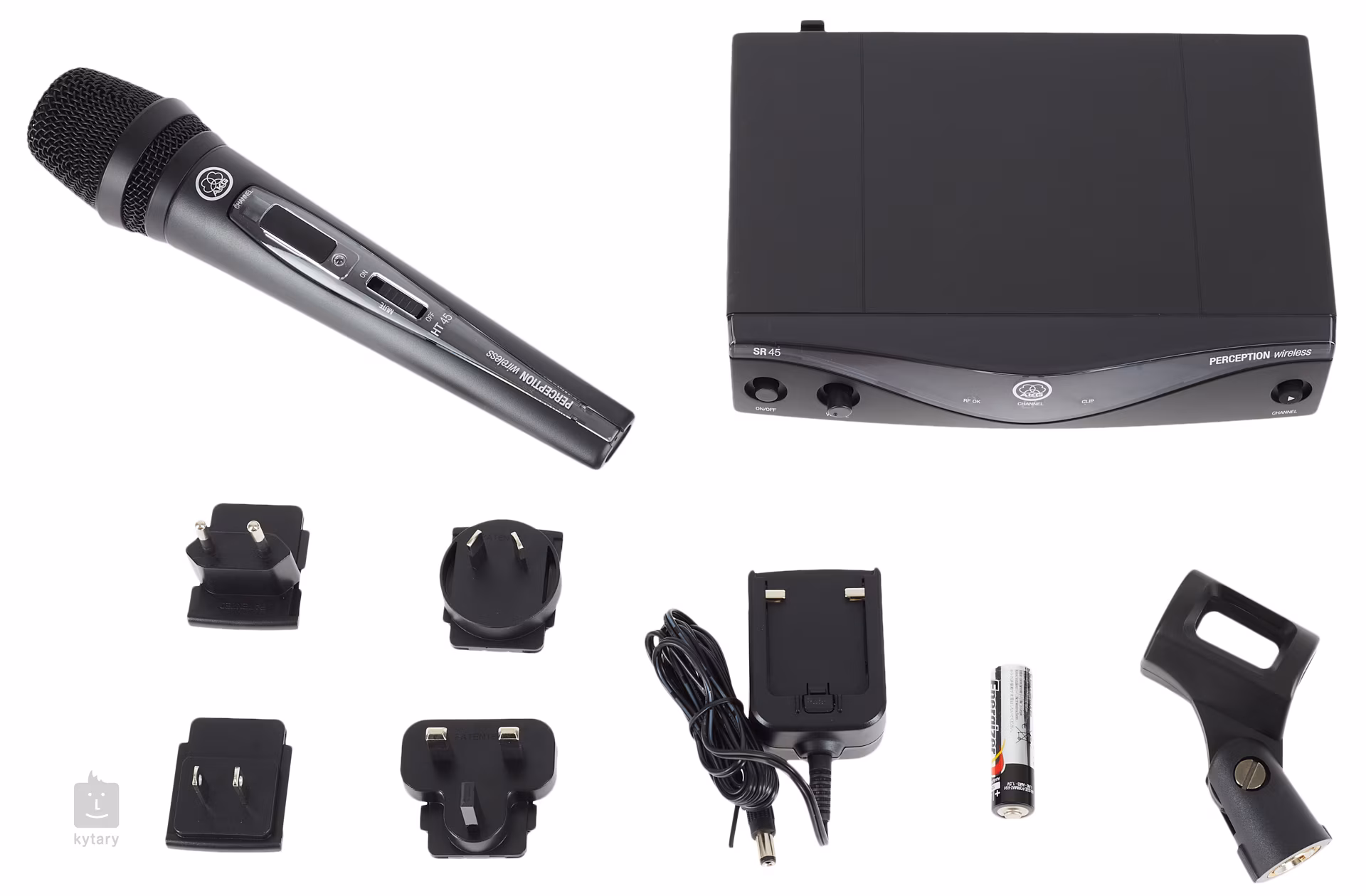 Das AKG Perception Wireless Vocal Set beinhaltet den AKG SR45 Empfänger und das AKG HT45 Handmikrofon. Der Empfänger verfügt über ein Minimum an Bedienelementen am Gehäuse, ohne dass die Parametereinstellung in irgendeiner Weise beeinträchtigt wird. Zu den Bedienelementen gehören ein Lautstärkepotentiometer, eine Kanaltaste zum Umschalten der Kanäle, ein LED-Display zur Anzeige des gewählten Kanals, LED-Signal- und Clipping-Anzeigen, ein Netzschalter und ein Trimmer zur Einstellung der Rauschsperre. Die Ausgänge sind mit XLR- und 1"-Klinkensteckern ausgestattet. Das Mikrofon enthält einen dynamischen Mikrofoneinsatz mit Nierencharakteristik. Es zeichnet sich durch eine hohe Widerstandsfähigkeit gegenüber mechanischen Geräuschen und Rückkopplungen aus. Auf dem Mikrofongehäuse befinden sich ein Display, das den gewählten Kanal anzeigt, eine Taste zum Umschalten der Kanäle, ein Schalter für die Mikrofonempfindlichkeit, eine LED-Batterieanzeige und ein Netzschalter. Das AKG HT45 wird mit einer einzigen AA-Batterie betrieben, mit der es eine Lebensdauer von bis zu 10 Stunden erreicht.