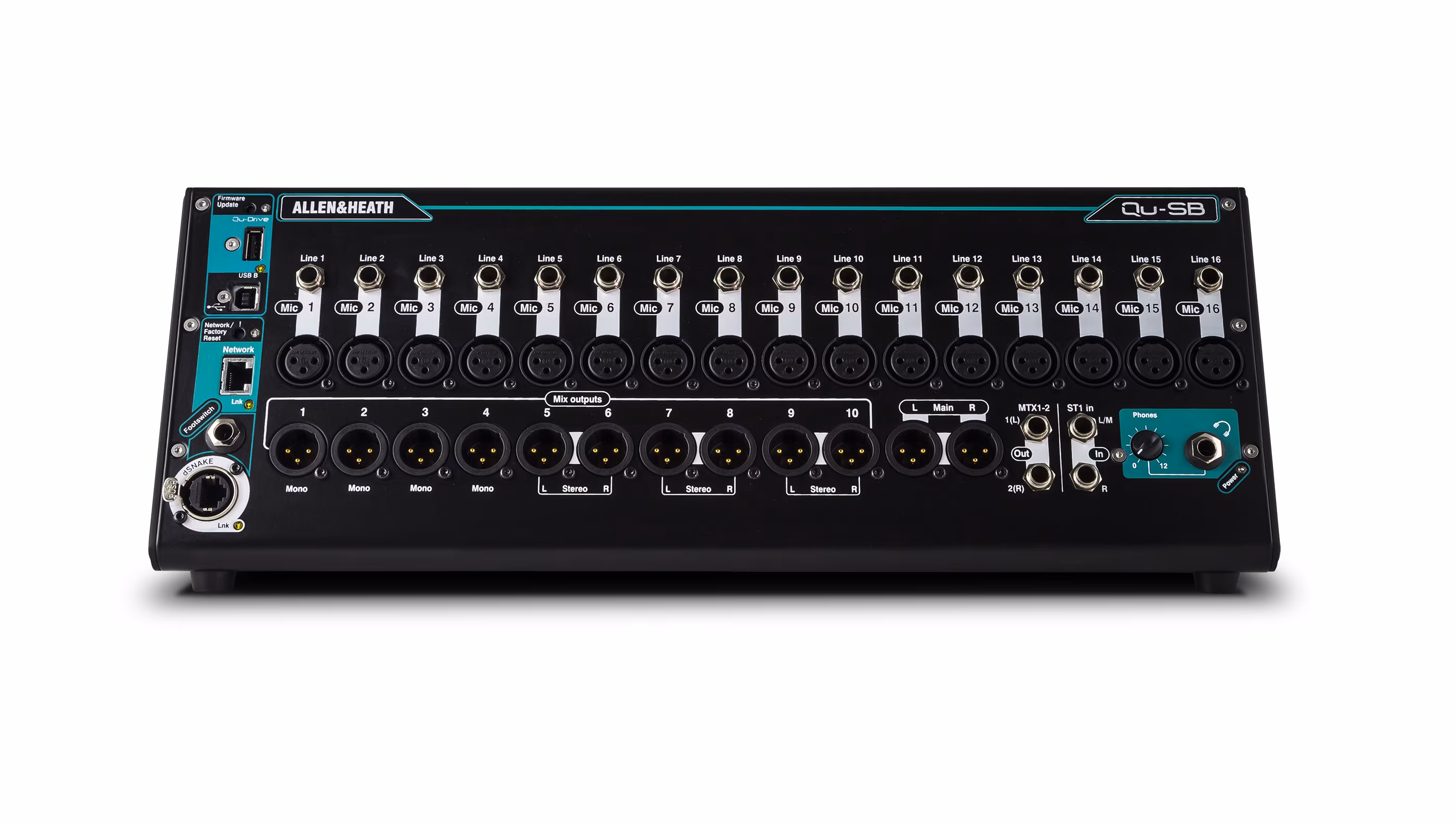 Allen & Heath Qu-SB ist ein digitales Mischpult, dessen Hauptvorteile seine kompakten Abmessungen und die Möglichkeit der Fernsteuerung über ein iPad sind.
