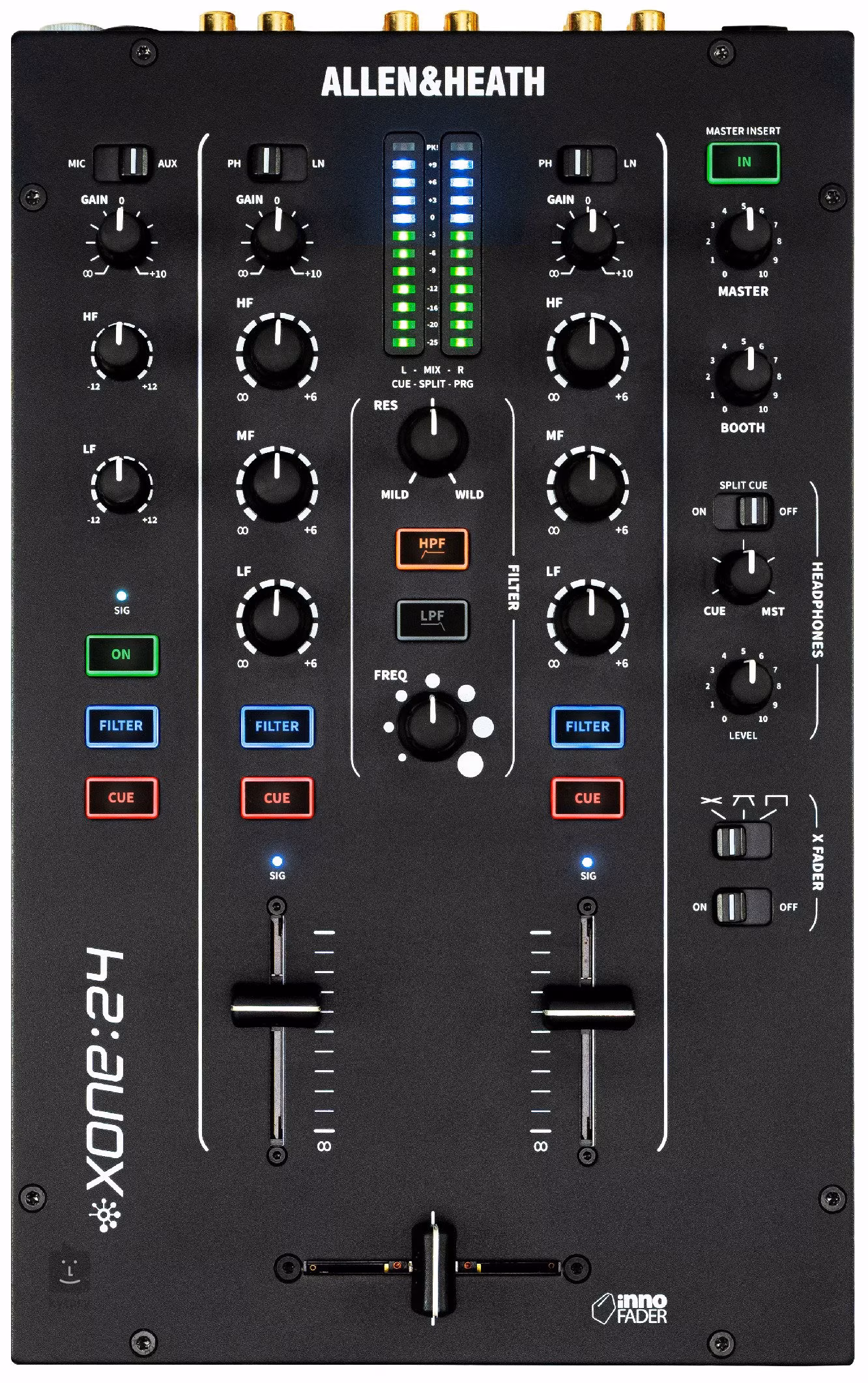 Der XONE:24 verfügt über mehrere Eingänge, darunter 3x RCA Line, 2x RCA Phono und 1x Combi Mic, die Flexibilität für den Anschluss verschiedener Geräte bieten. Zu den Ausgängen gehören 1x XLR Master und 1x RCA Booth, was eine direkte Verbindung mit verschiedenen Soundsystemen ermöglicht. Das Mischpult verfügt außerdem über einen 3-Band-Isolations-EQ, der eine detaillierte Klangbearbeitung über alle Frequenzen hinweg ermöglicht, sowie eine voll funktionsfähige FX-Schleife zum Anschluss externer Effekte.