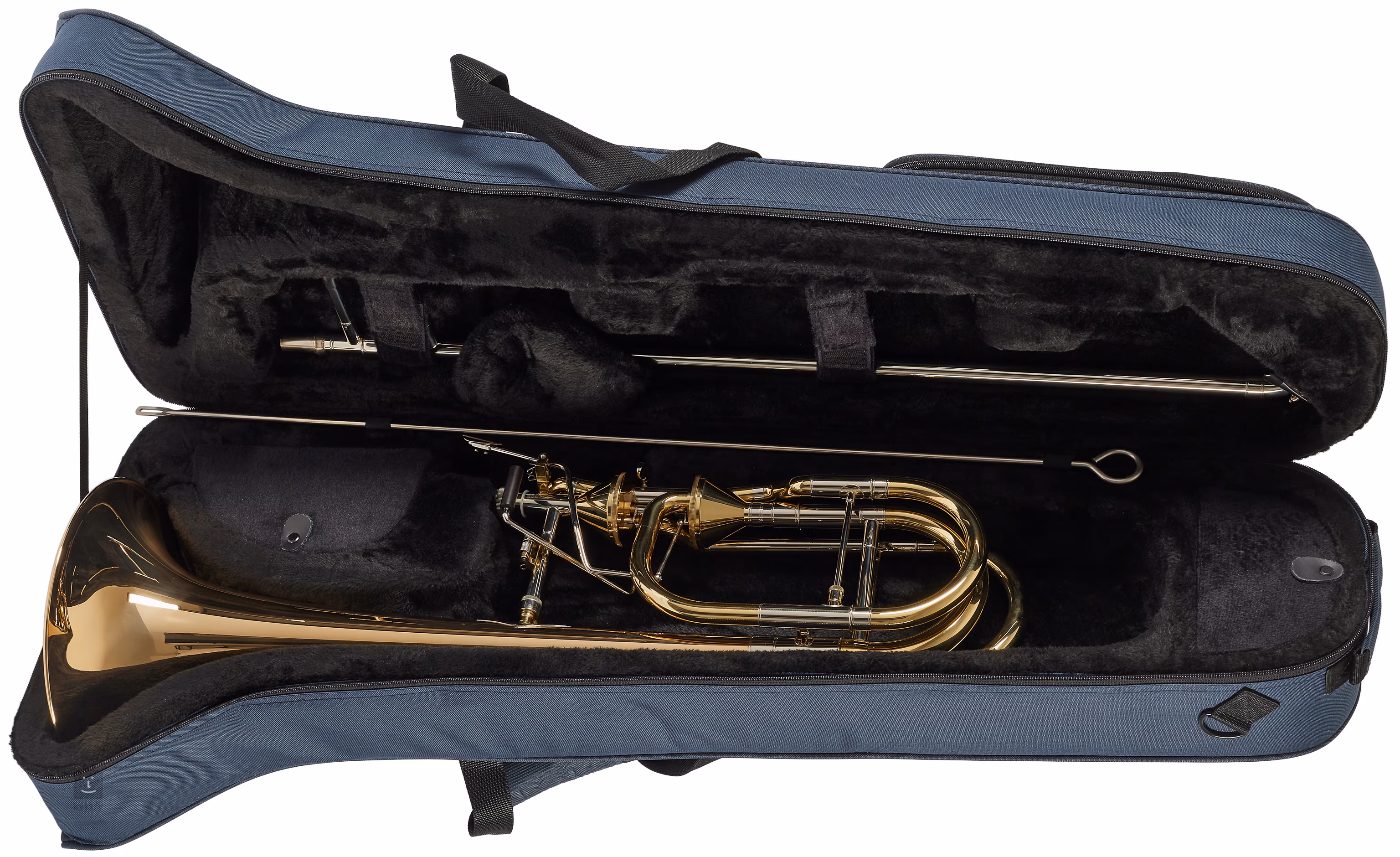 Die Basstrompete ASL-6118 verfügt über zwei Ventile im Thayer-Stil, einen Messingkörper, einen Schalltrichter aus Goldmessing, einen äußeren Dämpfer aus Pakfong (Nickelmessing) und einen verchromten inneren Dämpfer aus Pakfong. Die Posaune wird in einem Koffer mit Schultergurten geliefert.