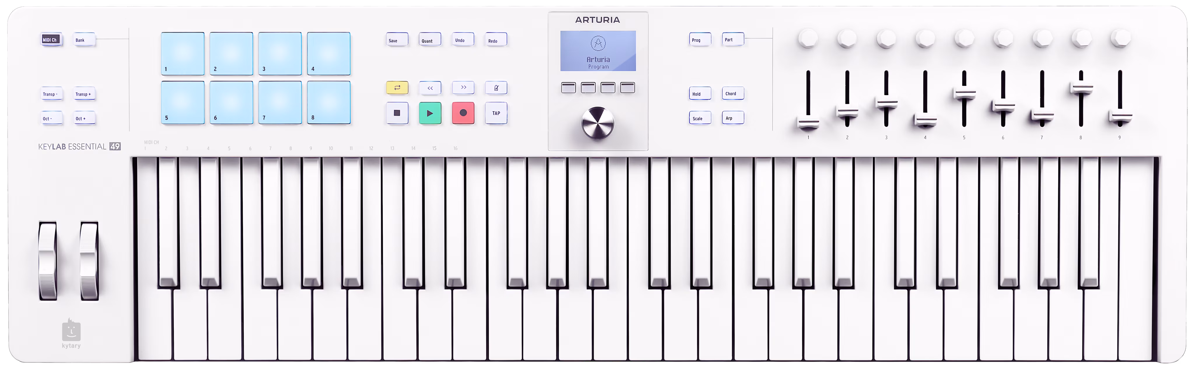 Das KeyLab Essential 49 MK3 verfügt über 49 dynamische Tasten, die ein reaktionsschnelles und ausdrucksstarkes Spiel ermöglichen. Die Tastatur ist so konstruiert, dass sie eine sanfte Ansprache und ein authentisches Spielgefühl für eine Vielzahl von Musikstilen bietet. Das Bedienfeld oberhalb des Keyboards bietet eine Vielzahl von Bedienelementen wie Drehknöpfe, Fader und druckempfindliche Pad-Sektionen. Es gibt einen ordentlichen Arpeggiator oder Akkordspiel- und Notensperrfunktionen. Das informative Display macht die Verwendung und Einrichtung der Funktionen schnell genug, und die Veränderung des traditionellen Workflows kann zu wichtigen Inspirationen führen.