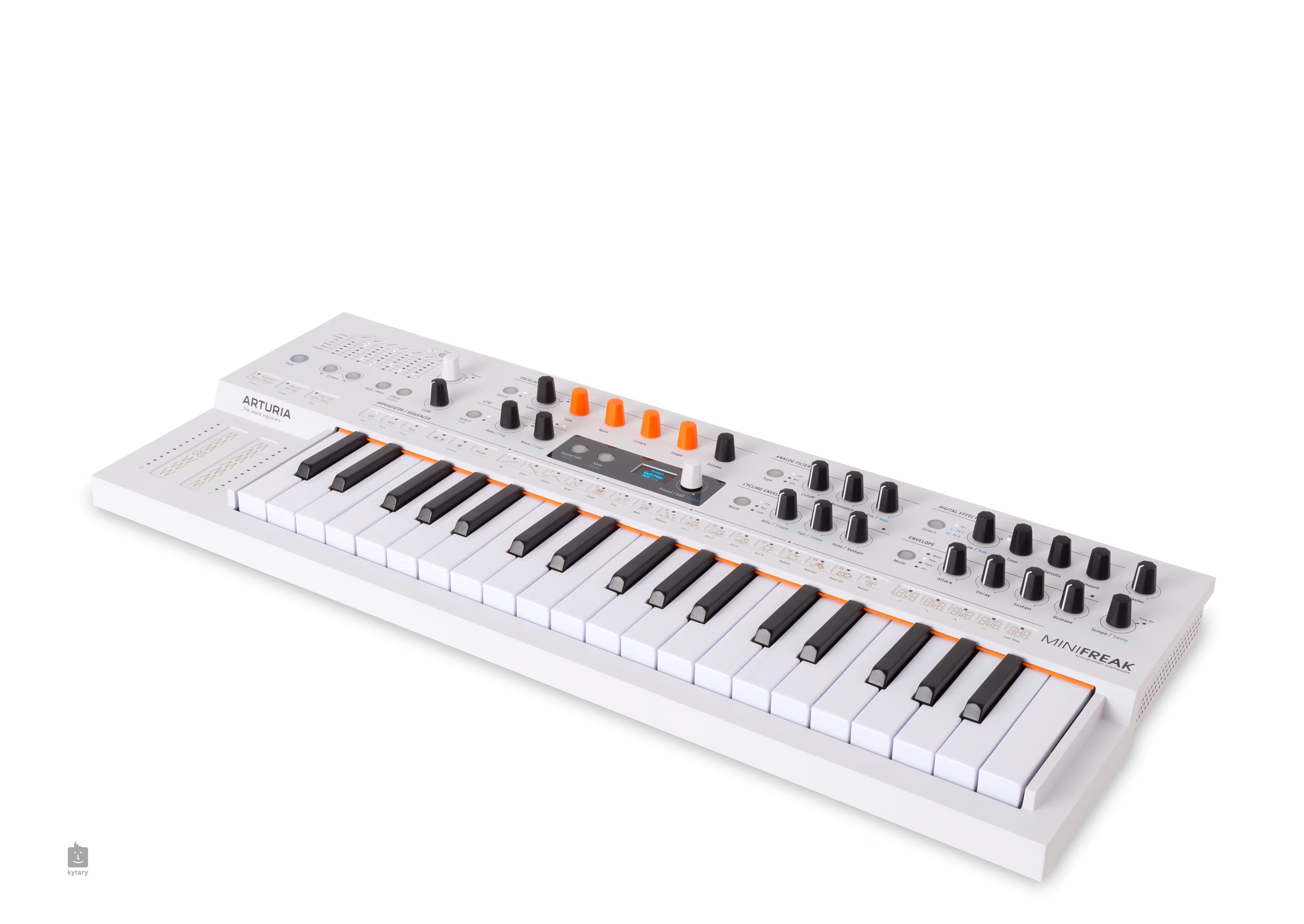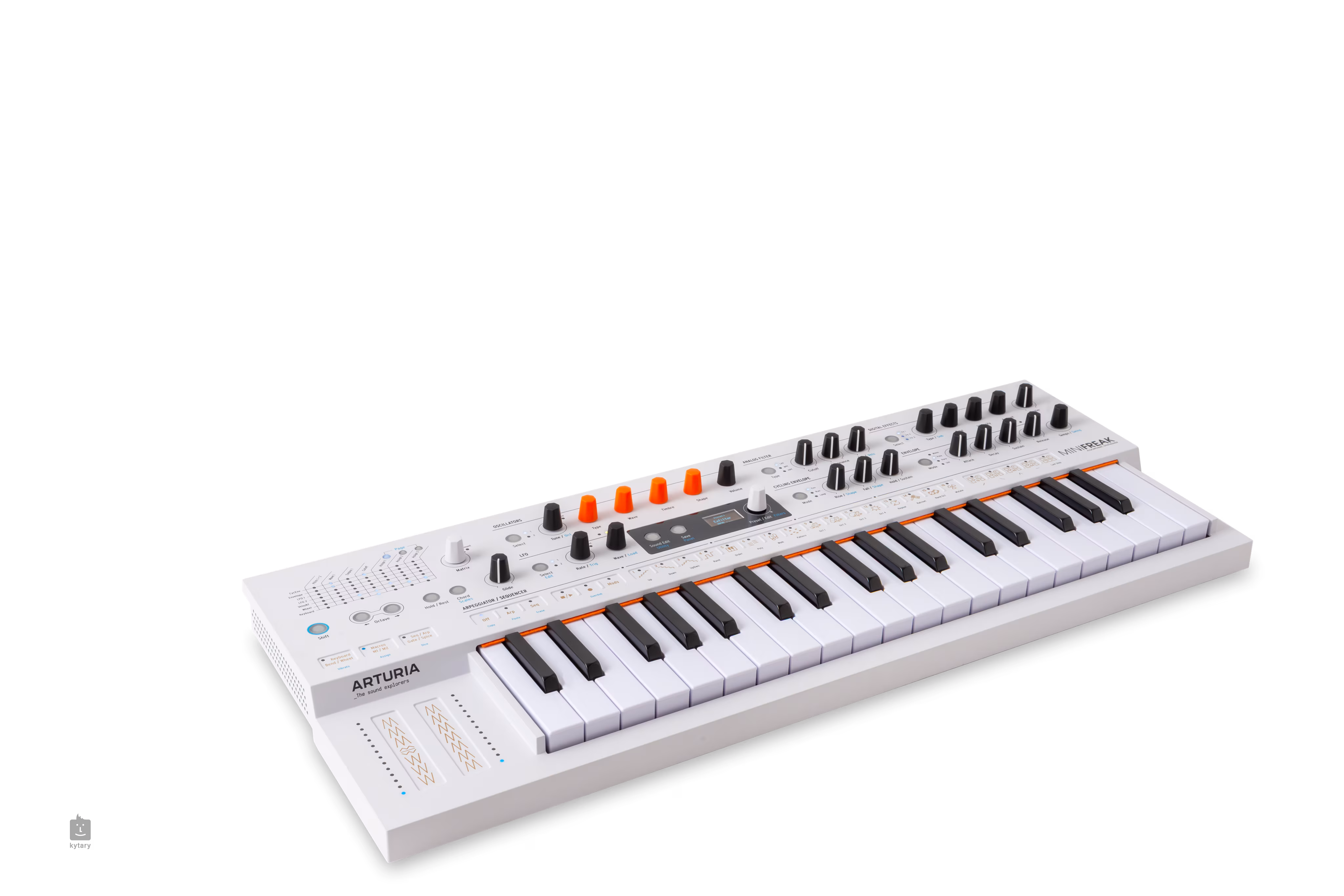 Das Instrument verfügt über Touch-Strips, ein OLED-Display, einen 64-Schritt-Sequenzer mit vier separaten Modulationslinien und einen leistungsstarken Arpeggiator mit zufälliger Oktavverteilung oder Ratchet-Funktion. Für den Live- und Studioeinsatz stehen drei digitale Effekt-Slots im Insert- oder Send-Modus zur Verfügung, darunter die Optionen Clean, Vintage, Narrow und Gated Vocoder.