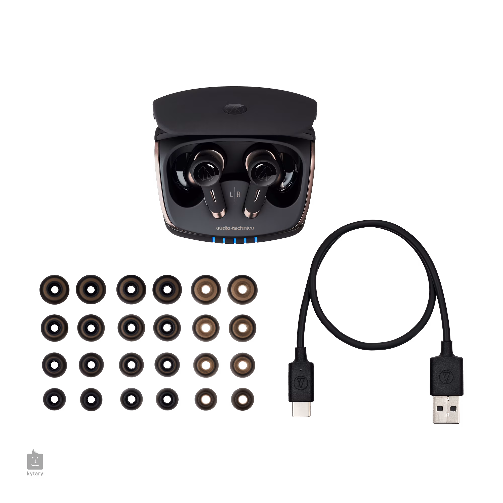 Im Lieferumfang enthalten sind ein USB-Ladekabel und vier Ohrmuschelgrößen (XS, S, M, L).