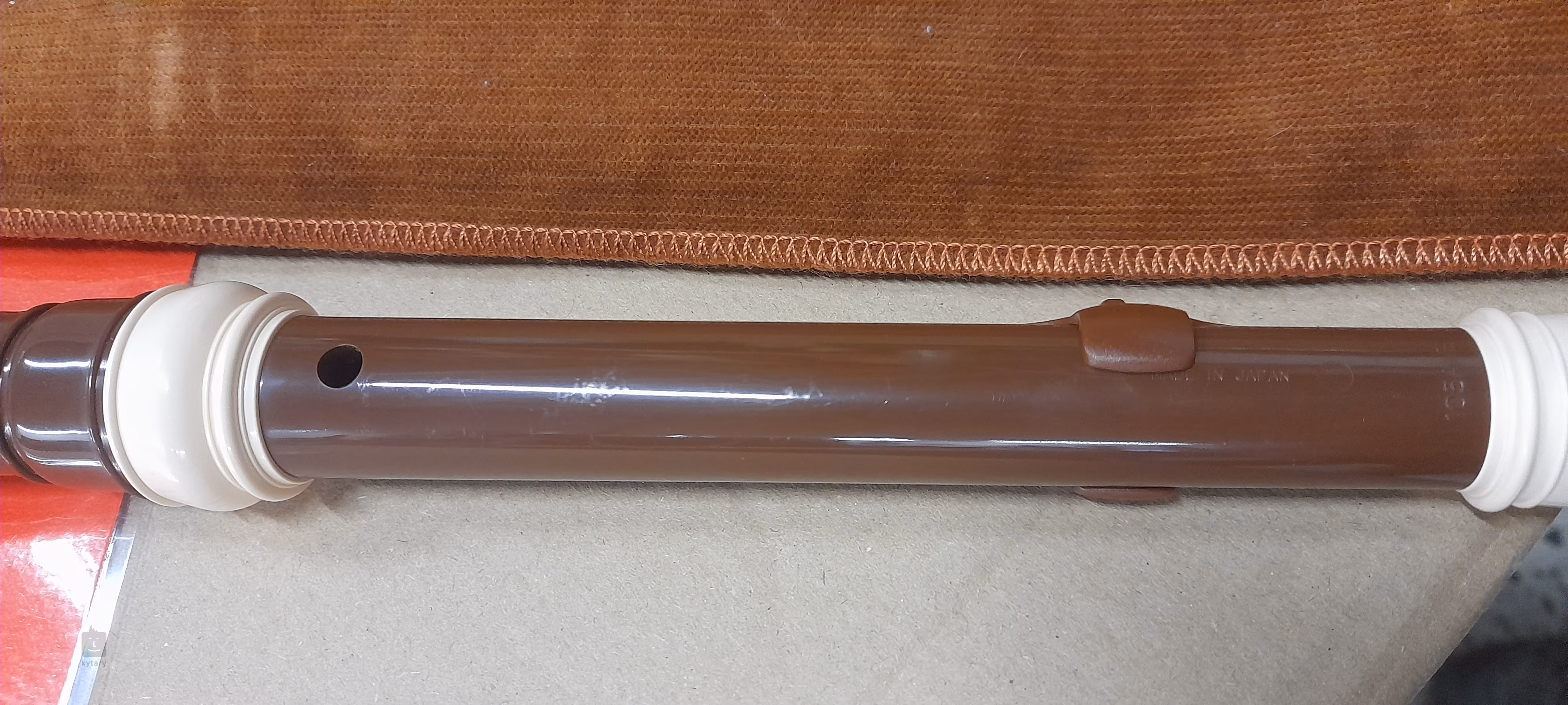 Sopranblockflöte in brauner Farbe. Das Instrument besteht aus Kunststoff und ist mit einem Textilüberzug versehen.