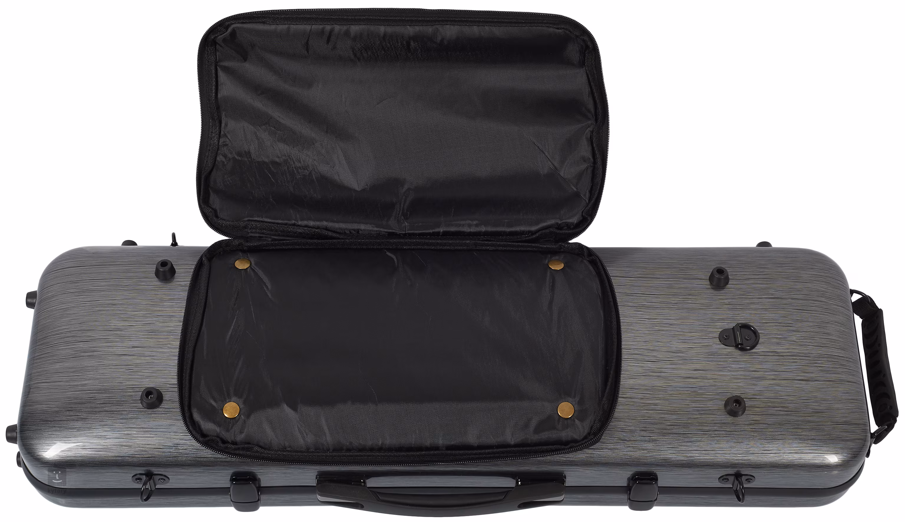 Geigenkoffer aus Kohlefaserverbundwerkstoff mit Metallbeschlägen, komfortablem Griff, Samtbezug im Inneren des Koffers, Notenetui, zwei Bogenhaltern und Gurt.