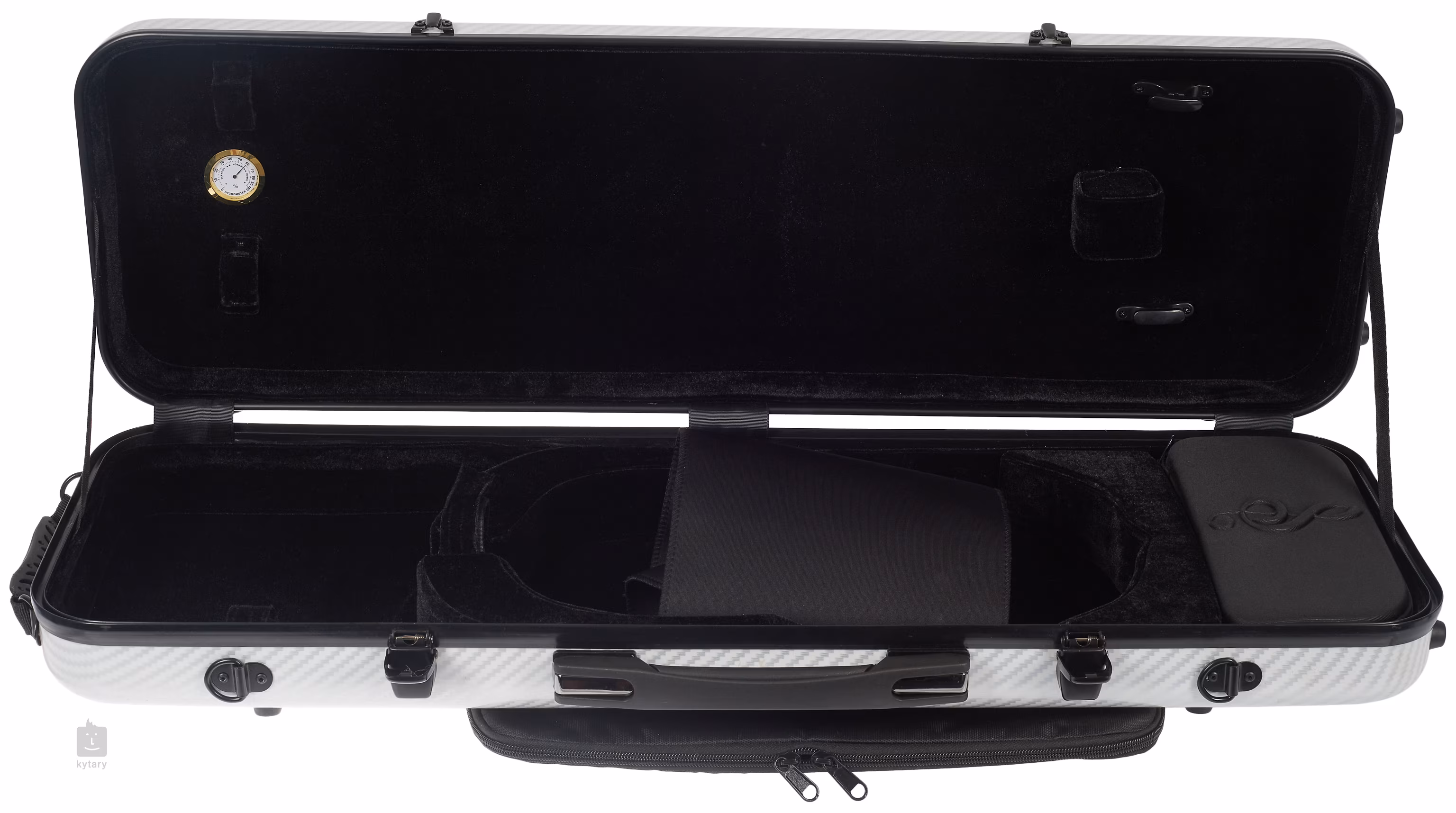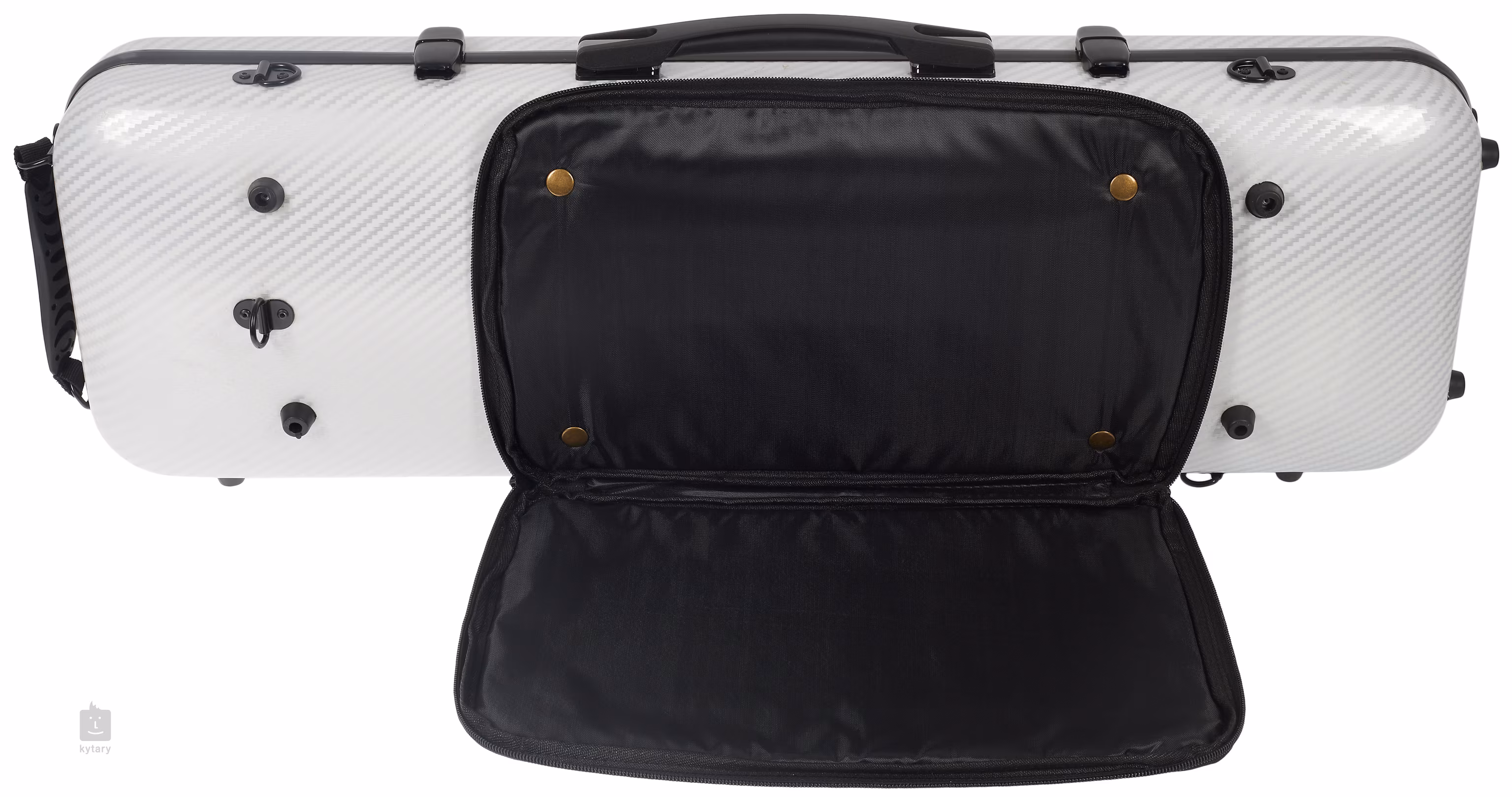 Geigenkoffer aus Kohlefaserverbundwerkstoff mit Metallbeschlägen, komfortablem Griff, Samtbezug im Inneren des Koffers, Notenetui, zwei Bogenhaltern und Gurt.