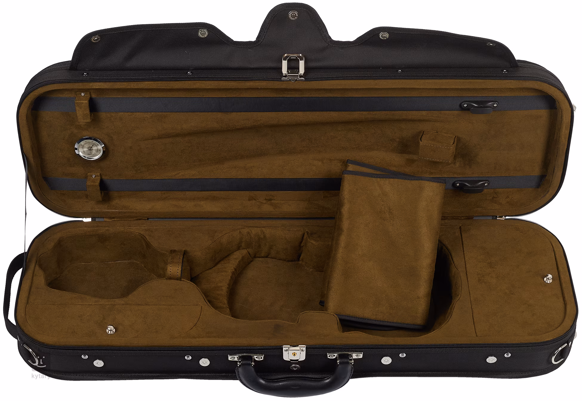 Dieser stilvolle Geigenkoffer bietet viele praktische Eigenschaften, vor allem aber einen wirklich zuverlässigen Schutz für Ihr Instrument. Sein Herzstück ist eine dicke Polsterung aus angenehm leichtem Schaumstoff, die Ihr Instrument vor Stößen und Erschütterungen schützt. Die äußere Schicht besteht aus strapazierfähigem Oxford-Gewebe, das den Koffer vor Schmutz und schlechtem Wetter schützt, während das Innere des Koffers mit Plüsch gefüttert ist, so dass Sie sich keine Sorgen um die Sicherheit der Lackierung des Instruments machen müssen. Natürlich sorgt die hochwertige Hardware für eine lange Lebensdauer des Gehäuses. Zwei Bogenhalterungen, ein Rohr zur Aufbewahrung von Ersatzsaiten, ein Hygrometer, ein Innenfach und eine geräumige Außentasche zur Aufbewahrung von Zubehör sowie ein Paar komfortable Griffe werden Sie begeistern.