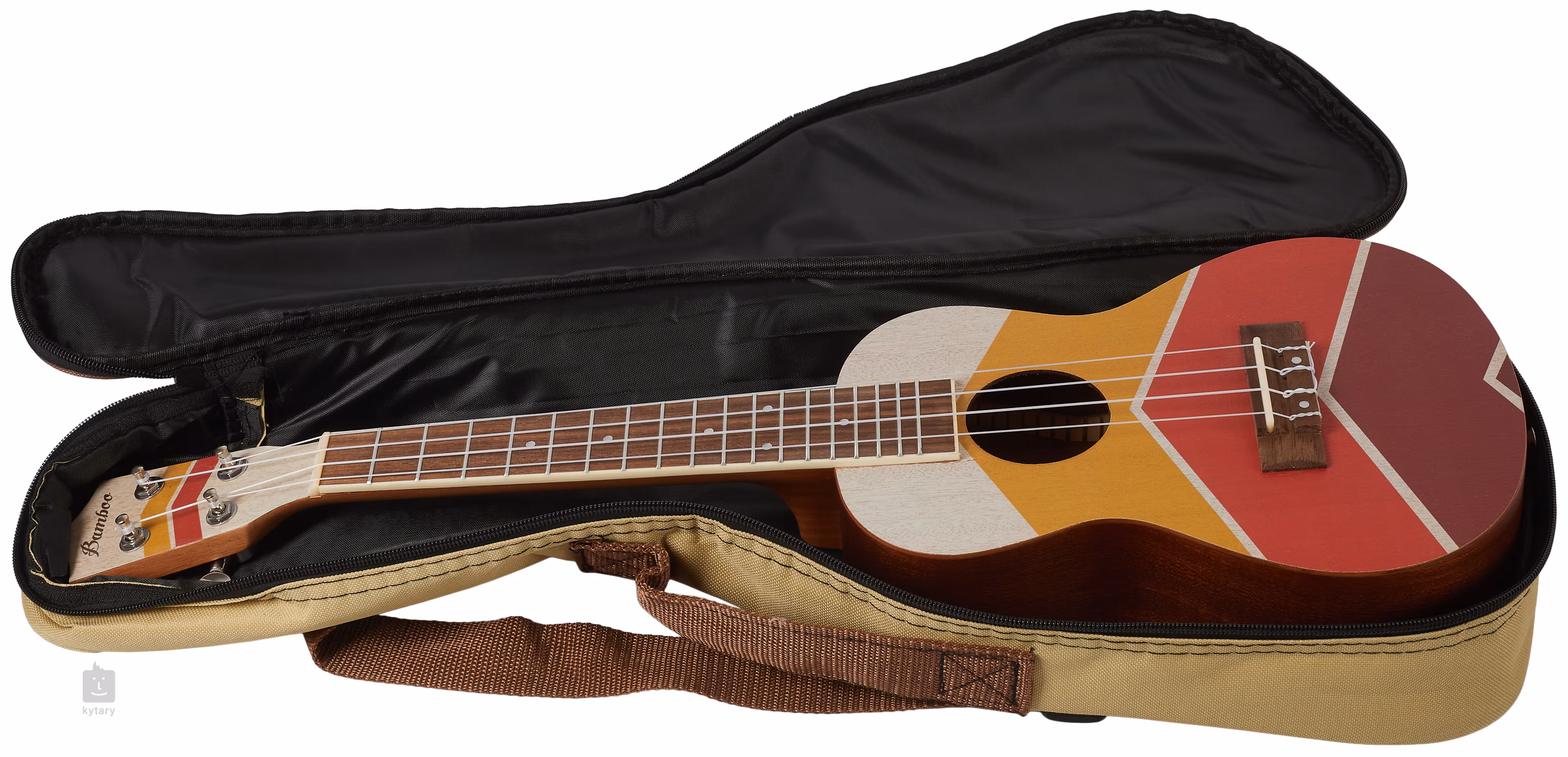 Die New Generation Linie von Bamboo bietet erschwingliche Ukulelen in Konzert- und Soprangröße, die mit farbenfrohen grafischen Motiven verziert sind. Die Burning Sunrise Konzert-Ukulele hat einen Korpus aus laminiertem Sapelholz, einen Okoumé-Hals, ein Griffbrett aus Walnussholz und eine Knochensaitenaufhängung über dem Nullbund in einer offenen Gitarrenmechanik. Das Instrument wird in einem Koffer geliefert.