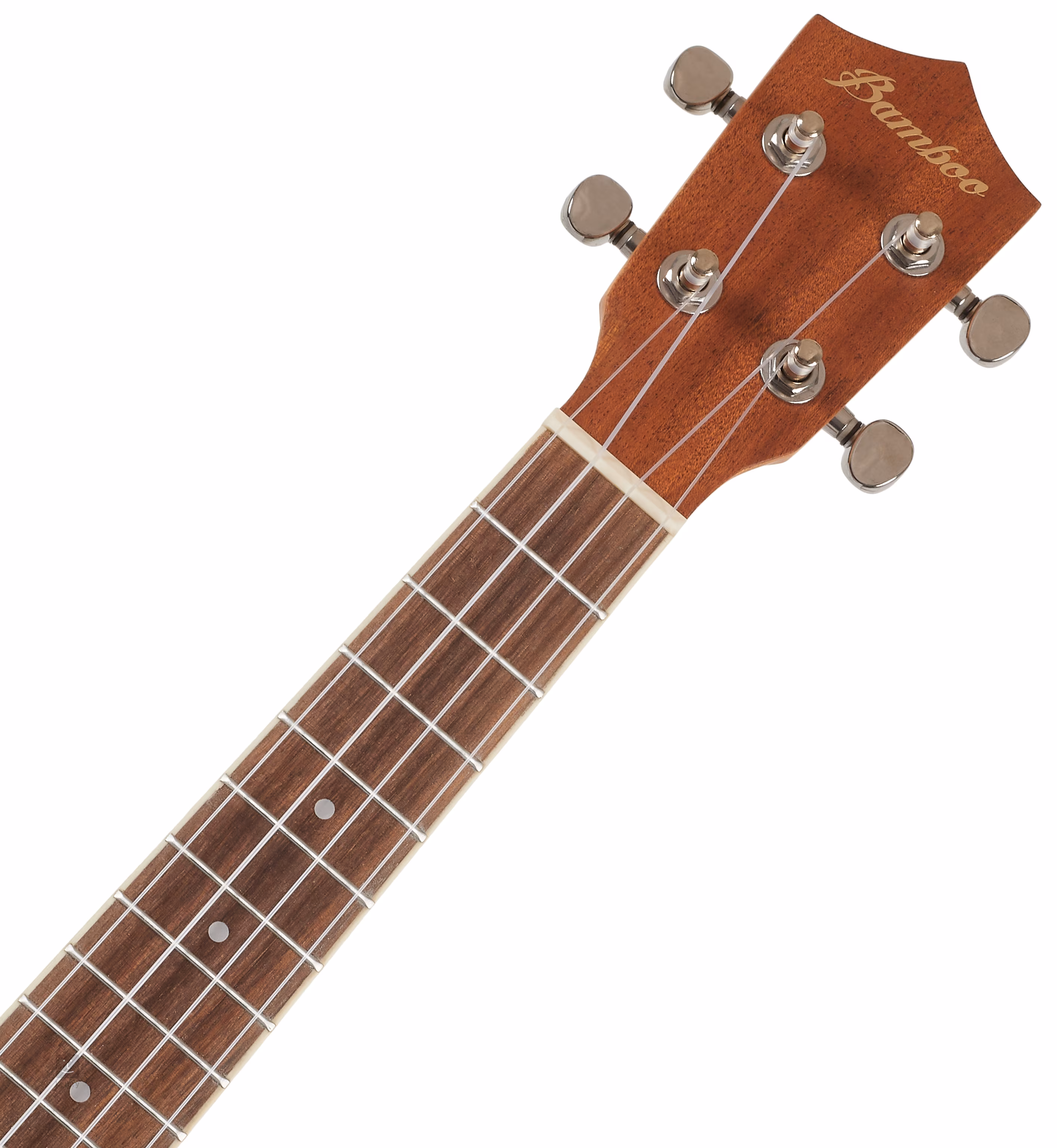 Die New Generation Linie von Bamboo bietet erschwingliche Ukulelen in Konzert- und Soprangröße, die mit farbenfrohen grafischen Motiven verziert sind. Die Konzert-Ukulele mit Indie-Label hat einen Korpus aus laminiertem Sapele, einen Okoumé-Hals, ein Griffbrett aus Walnussholz und eine Saitenaufhängung aus Knochen über dem Nullbund in einer offenen Gitarrenstimmung. Das Instrument wird in einem Koffer geliefert.
