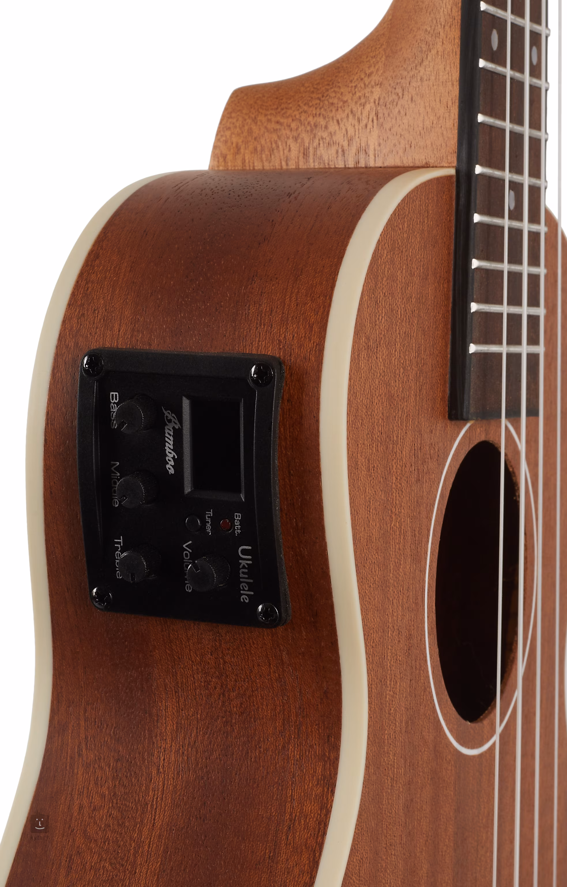 Für die Klangverstärkung sorgt der Vorverstärker des Unternehmens mit Dreiband-Equalizer und eingebautem Stimmgerät, der im Balg der Ukulele installiert ist.