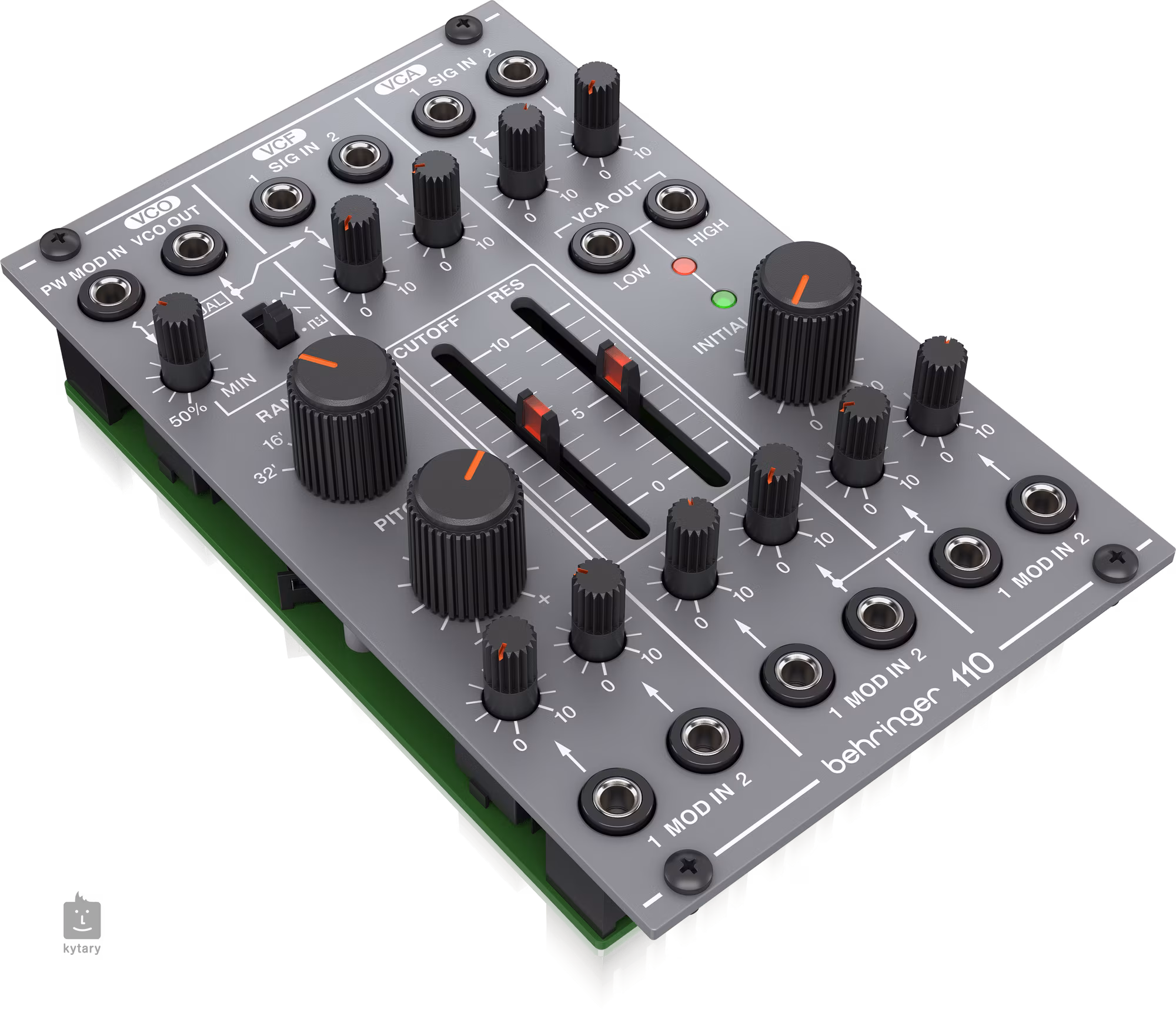 Die VCF-Sektion verfügt über Schieberegler zur Steuerung von Cutoff-Frequenz und Resonanz, während die VCA-Sektion zwei Audioausgänge (Low/High) besitzt. VCF und VCA haben jeweils zwei Audio- und zwei CV-Eingänge für den Anschluss externer Signalquellen und Regler.