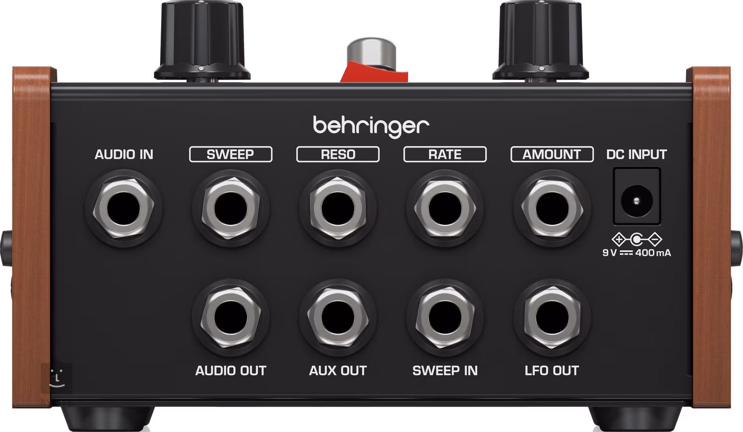 Die Box bietet die gleichen Features wie das Original, was sich auch im Klang widerspiegelt, der vom Moog kaum zu unterscheiden ist. Darüber hinaus bietet die Rückseite eine Fülle von Anschlussmöglichkeiten, so dass Sie externe Expression-Pedale und VC-Controller für noch mehr Flexibilität anschließen können. Zusätzlich zu den Standard-Instrumentenein- und -ausgängen finden Sie hier Anschlüsse für externe Pedale, mit denen Sie die Parameter Sweep, Resonance, Rate und Amount steuern können. Außerdem gibt es einen LFO-Ausgang, um das LFO-Signal an andere Steuergeräte zu leiten, einen Aux-Ausgang, mit dem Sie das modifizierte Signal weiterleiten können (dieser Ausgang kann auch zur Erzeugung eines Stereoeffekts verwendet werden) und einen Sweep-Eingang, mit dem Sie den Effekt mit einem externen LFO-Modul steuern können. Das Steckerset ist mit einer Standard-Gleichstrombuchse für den Anschluss eines Netzteils abgeschlossen, das nicht im Lieferumfang enthalten ist.