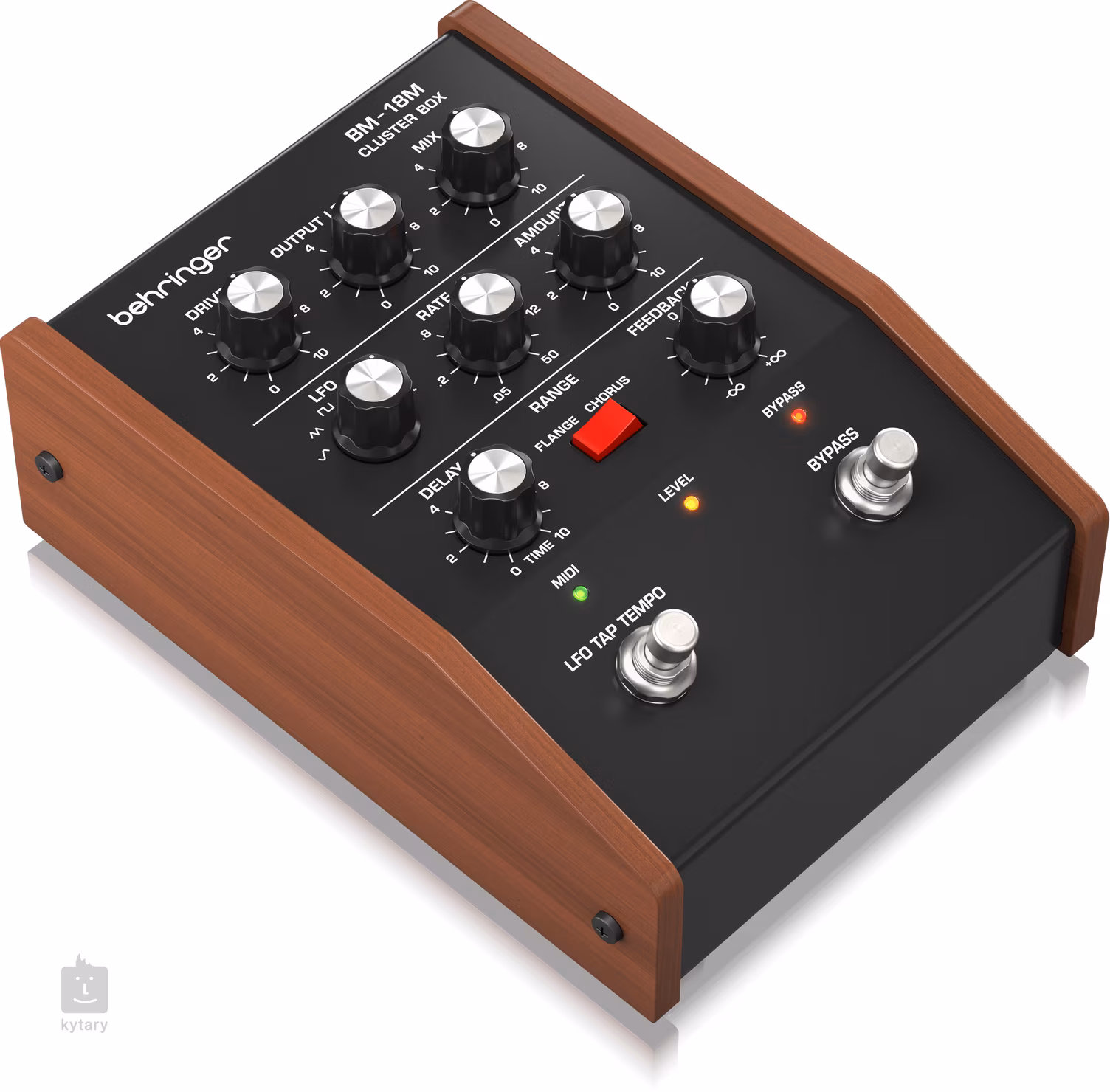 2x FS (LFO Tap Tempo, Bypass), Drive, Output Level, Mix, LFO, Rate, Amount, Delay, Feedback, Range Switch (Flange/Chorus)