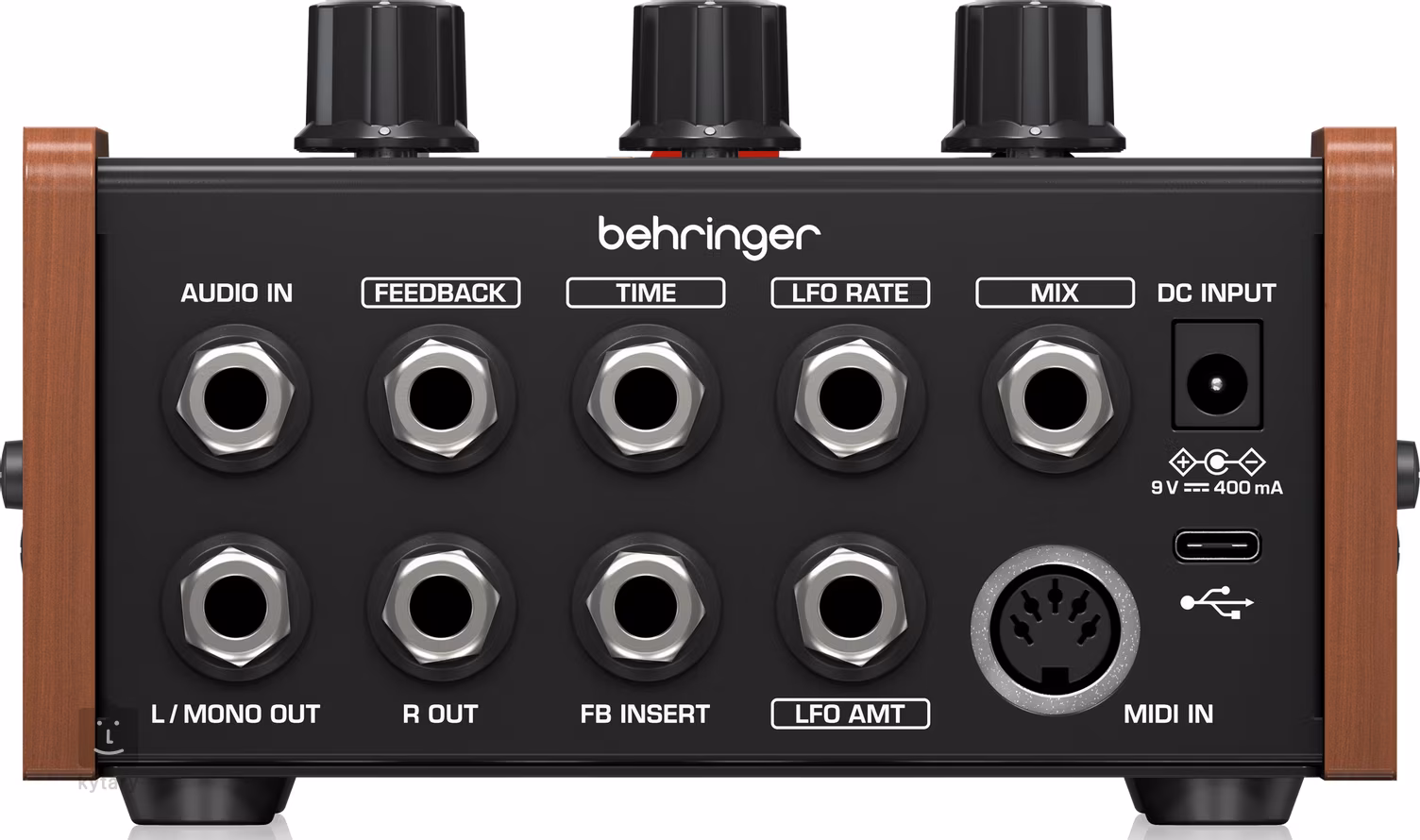 2x Jack TS 6,3 mm (Audio in, FB Insert), 5x Jack TRS 6,3 mm (Feedback, Time, LFO Rate, LFO Amount, Mix), 1x MIDI In, 1x USB-C