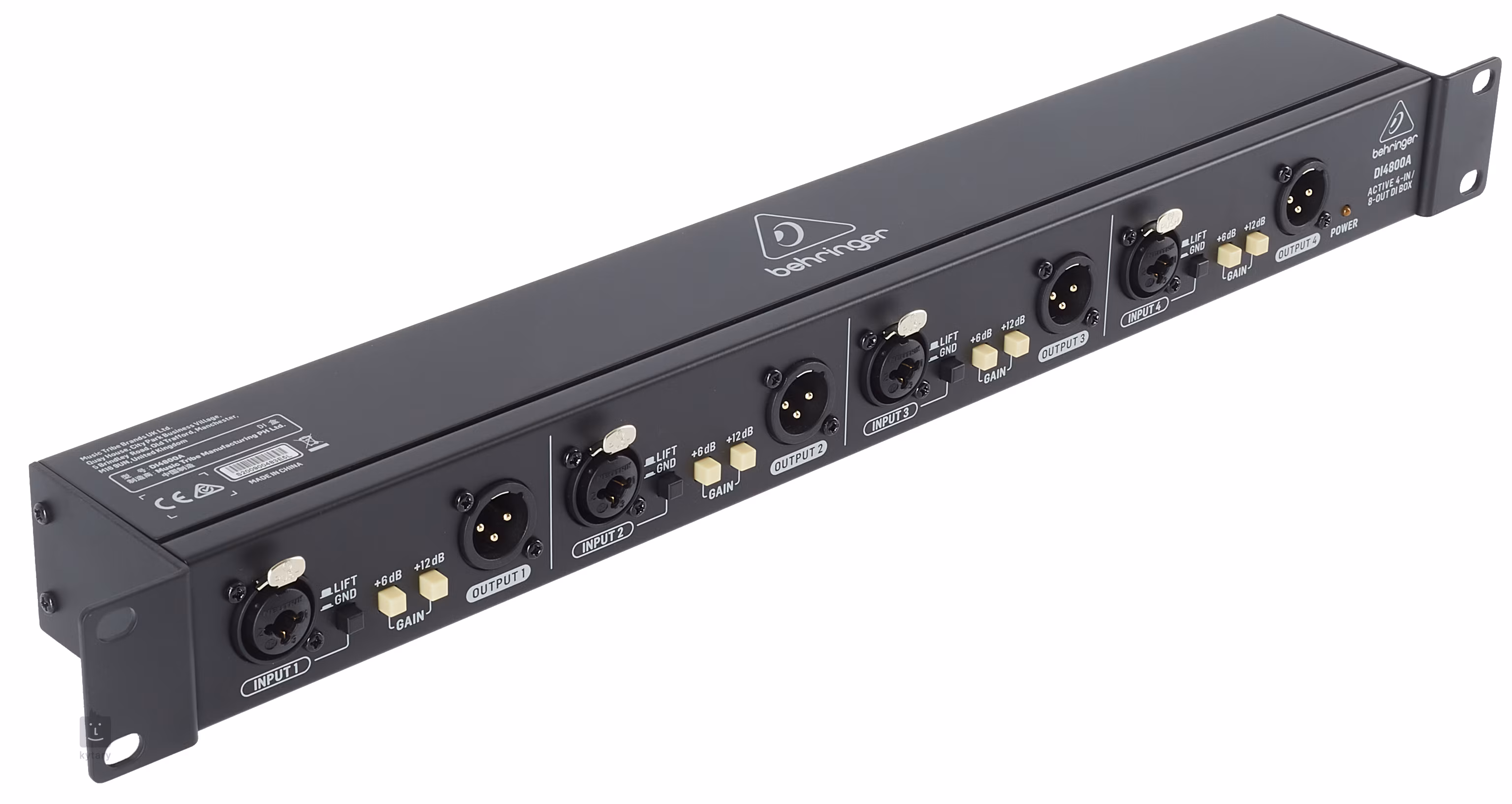 Der Behringer ULTRA-DI PRO DI4800A ist eine professionelle aktive Vierkanal-DI-Box im 1U-Rackformat. Jeder Kanal verfügt über einen kombinierten Eingang (XLR oder 6,3-mm-TRS-Klinke) und zwei XLR-Ausgänge (jeweils einen auf der Vorder- und einen auf der Rückseite), sodass das Gerät das Signal auf insgesamt acht Ausgänge verteilen kann. Die DI4800A ist so konzipiert, dass sie sich an praktisch jedes Eingangssignal anpassen lässt. Zur Verstärkung dienen zwei GAIN-Schalter (+6 dB und +12 dB), die zusammen eine Eingangsverstärkung von bis zu 18 dB bieten. Am Ausgang ist hingegen ein PAD mit umschaltbarer Ausgangsdämpfung von -20 dB implementiert, während die hoch angesehenen OT-1-Ausgangstransformatoren für einen sauberen Ausgang sorgen. Zur Filterung von Brummschleifen kann der LIFT/GND-Schalter verwendet werden.