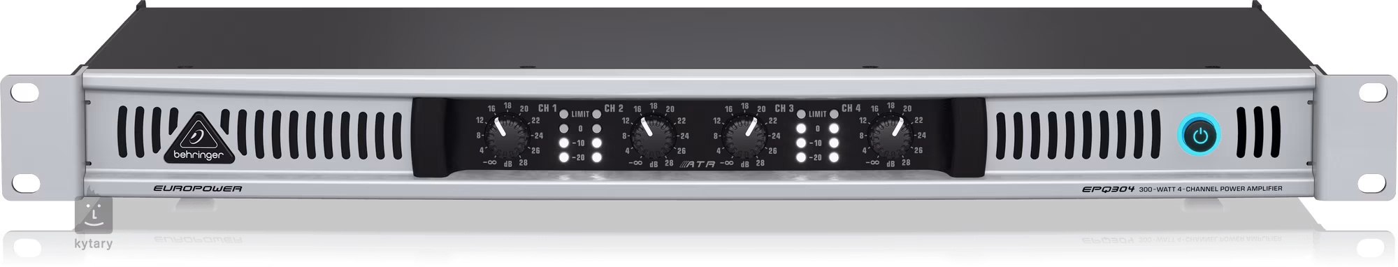 Der Behringer EPQ304 ist ein leichter, vierkanaliger Class-D-Verstärker mit einer maximalen Ausgangsleistung von 300 W, einfachen Bedienelementen in Form von separaten Kanal-Lautstärkereglern mit LED-Leistungsanzeige, vier kombinierten XLR/Klinken 6,3 mm-Eingängen und Speakon-Ausgängen.