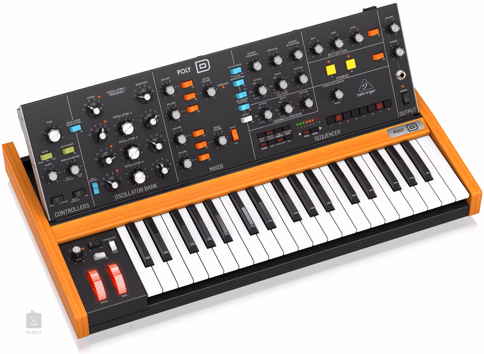 Zu den weiteren Funktionen, die Behringer in den POLY-D integriert hat, gehören ein sequenzieller Step-Sequenzer und ein Arpeggiator, mit denen Benutzer komplexe Melodiemuster und Rhythmen erstellen können. Darüber hinaus verfügt das Modell über eine robuste Tastatur mit Aftertouch und Portamento-Steuerung für noch mehr Ausdruckskraft.