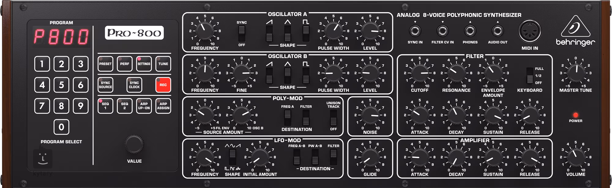 Der Behringer Pro-800 ist ein Synthesizer, der sich dank seiner reichhaltigen Palette an klanglichen Möglichkeiten einen Namen in der Welt der elektronischen Musik gemacht hat. Jede Stimme dieses Instruments wird von zwei Oszillatoren erzeugt, die jeweils drei Wellenformen zur Auswahl haben: Sägezahn, Dreieck und Rechteck, jeweils mit Pulsbreiten- und Pegelregler. Das Instrument verfügt außerdem über einen Tiefpassfilter (-24 dB/Okt.) mit Resonanzkontrolle, Hüllkurvenmodulation und Key Tracking, mit dem der Hersteller den Charakter des Klangs präzise gestalten kann. Hinzu kommen ein Rauschgenerator und ein LFO mit sechs wählbaren Wellenformen und Modulationszielen (Tonhöhe, Pulsbreite und Filterfrequenz).
