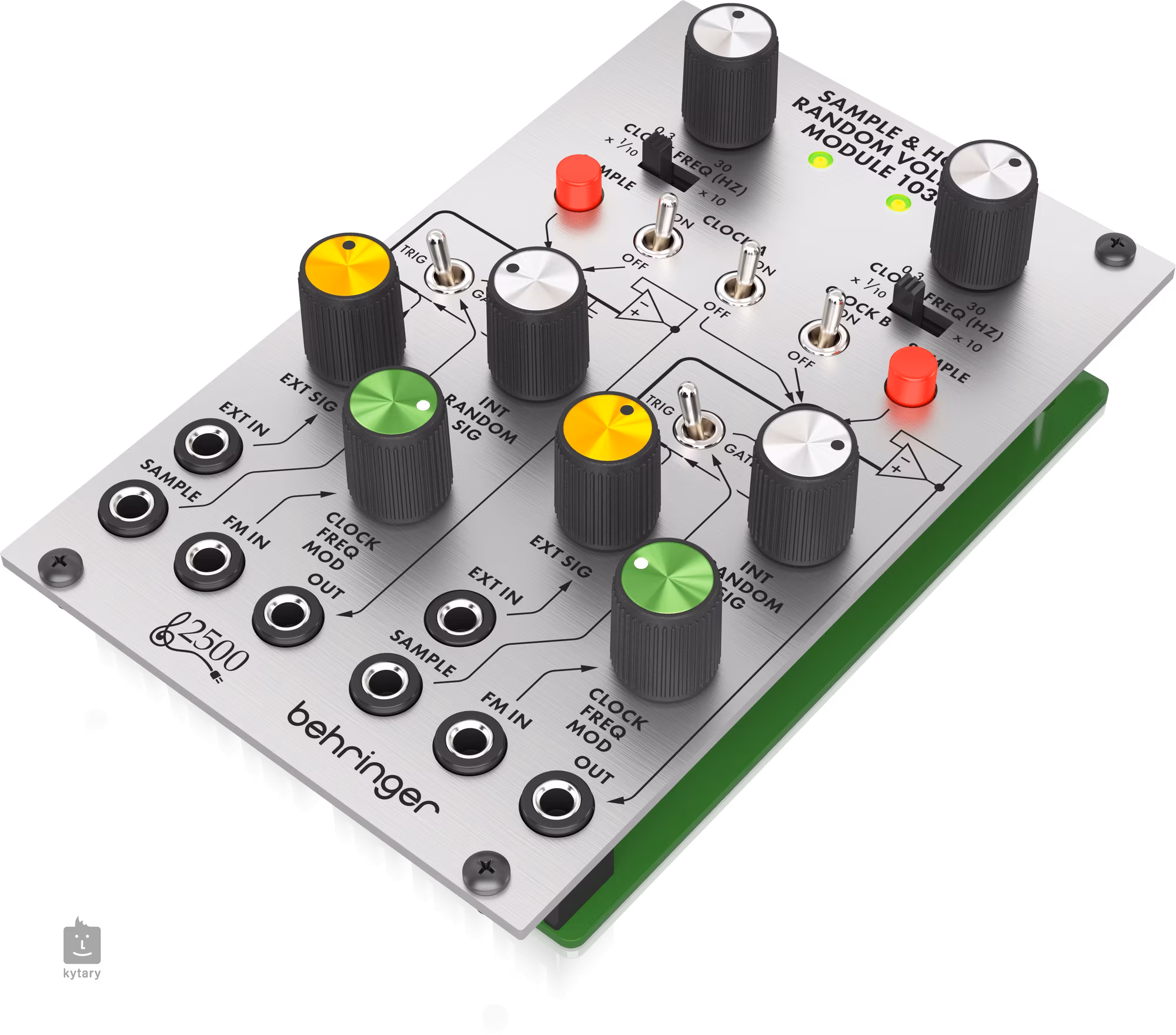 Das Behringer 1036 SAMPLE & HOLD/RANDOM VOLTAGE MODULE enthält 2 unabhängige Sample- und Hold-Schaltungen, 2 Zufallsrauschgeneratoren und 2 spannungsgesteuerte Clocks. Es erzeugt zufällige Tonfolgen, Skalen und Arpeggios. Jede Sample- und Hold-Schaltung verfügt über einen Audioeingang und einen Signalausgang sowie einen Eingang zur Steuerung des Timings von Samples aus verschiedenen Quellen. Mit dem Taktfrequenzregler werden die Frequenz der einzelnen Takte und die Samplefrequenz eingestellt. Das Sampling kann manuell über die Tasten gesteuert werden. Die Abtastung kann extern durch ein Trigger- oder Gate-Signal gesteuert werden. Ein intern erzeugtes Zufallssignal kann als Sampelsignal mit einstellbarem Pegel für jeden Schaltkreis verwendet werden.