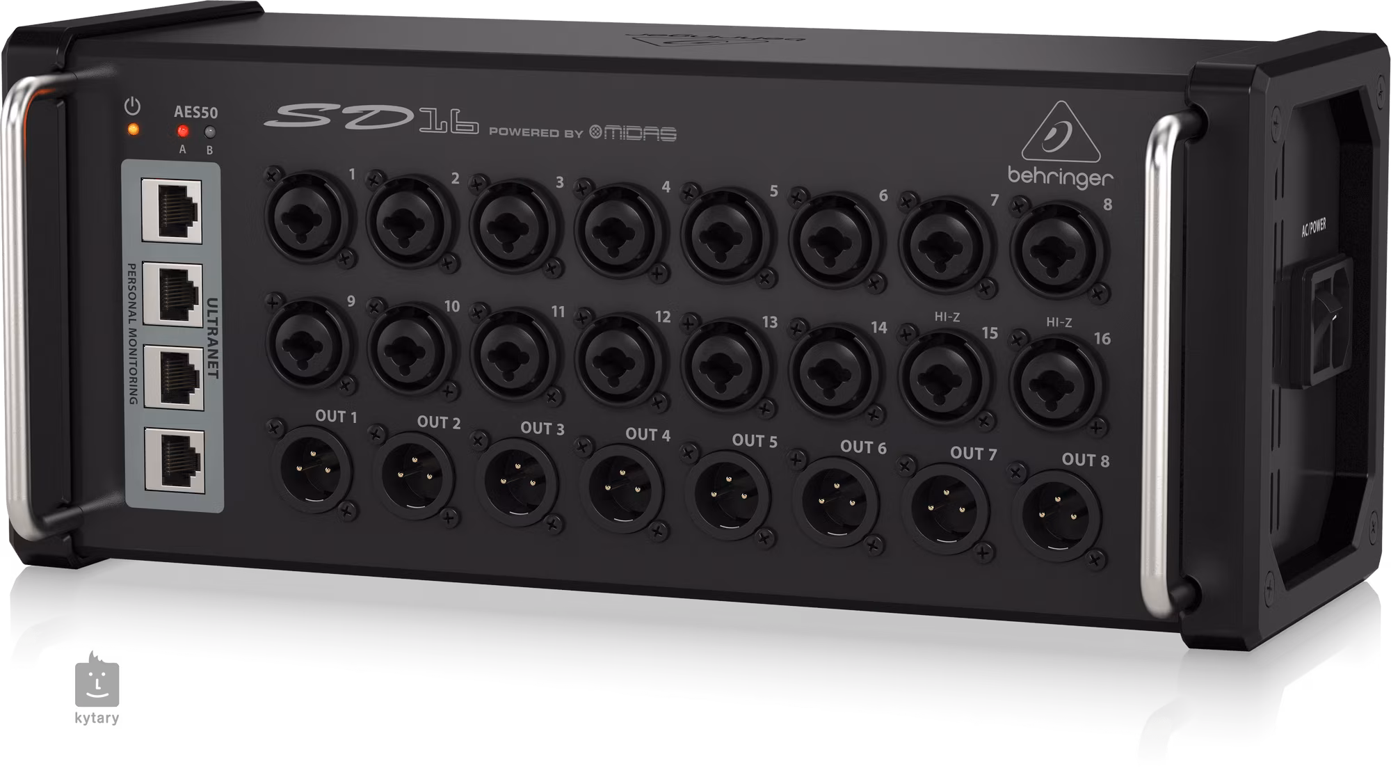 Die Behringer SD16 ist eine I/O-Stagebox mit sechzehn fernsteuerbaren Midas-Preamps, acht Ausgängen, einem AES50-Netzwerk und einem ULTRANET Personal Monitoring Hub.