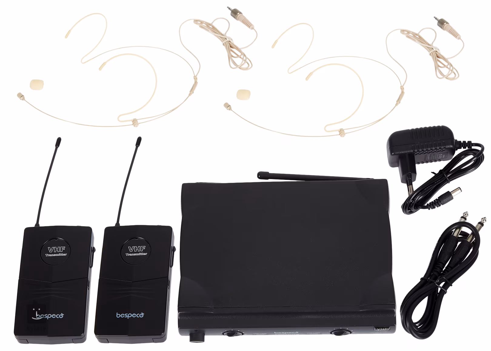 Im Lieferumfang enthalten sind ein Sender, ein Empfänger, 2 Kopfmikrofone und ein Netzadapter.