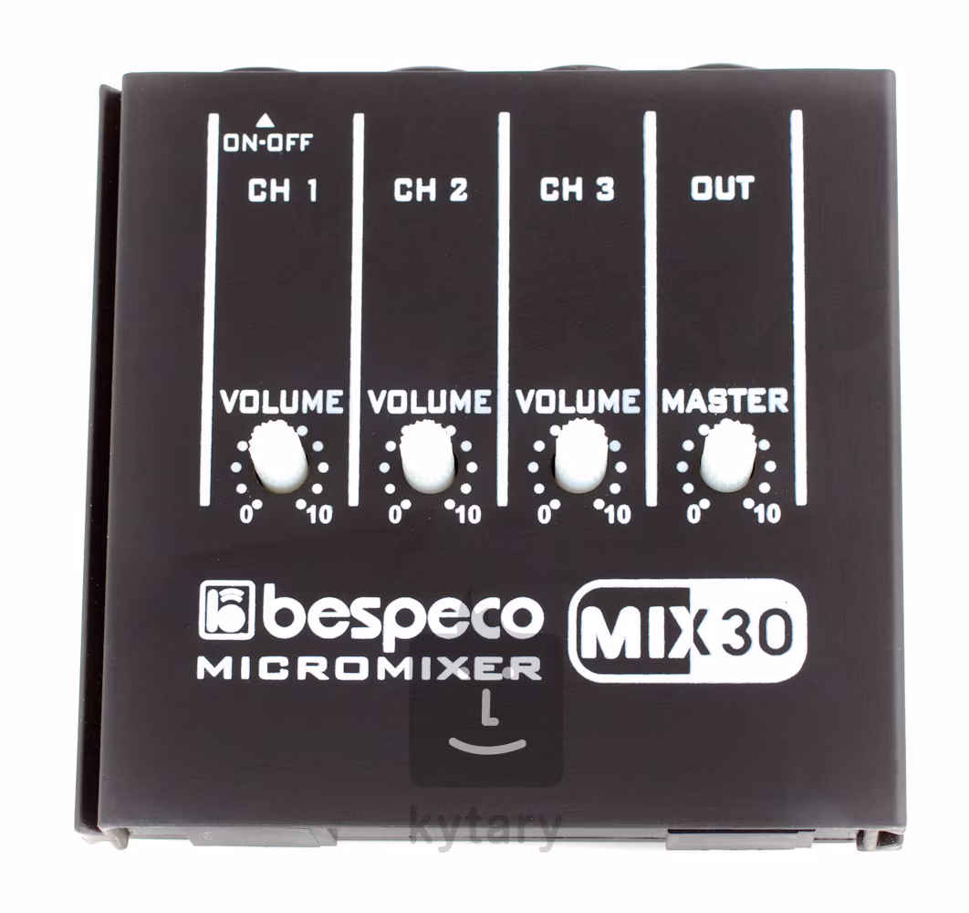 Das Bespeco MIX30 ist ein einfaches, kleines Dreikanal-Mischpult, an das Sie 3 Monosignale anschließen, mit den Lautstärkepotentiometern mischen und an den Monoausgang senden können. Die Stromversorgung erfolgt über eine 9-V-Batterie (nicht im Lieferumfang enthalten).