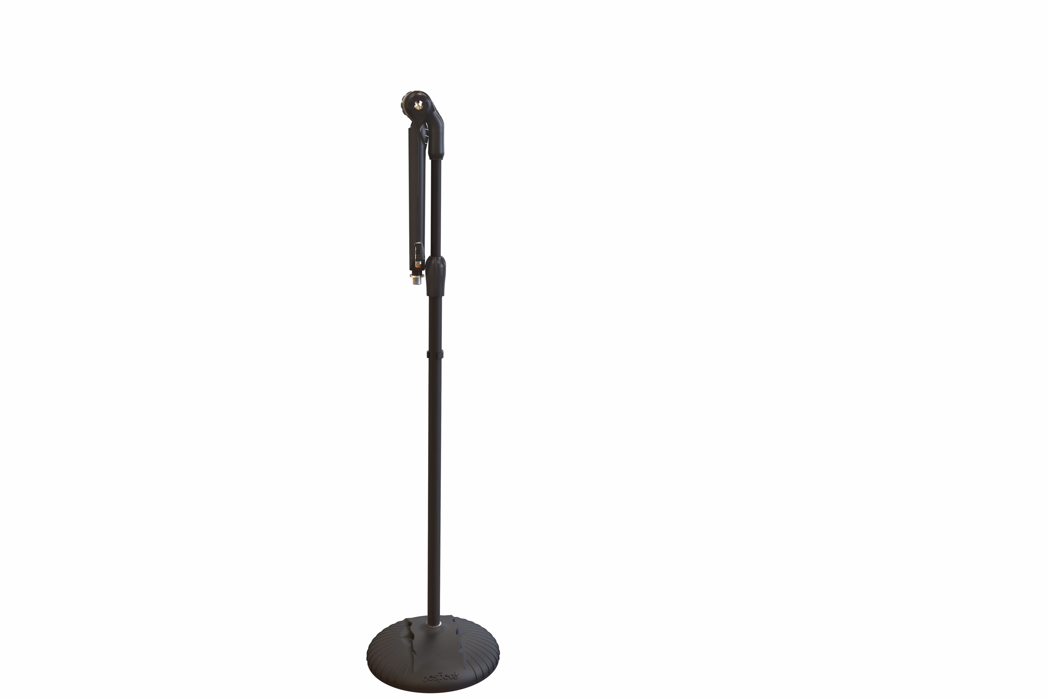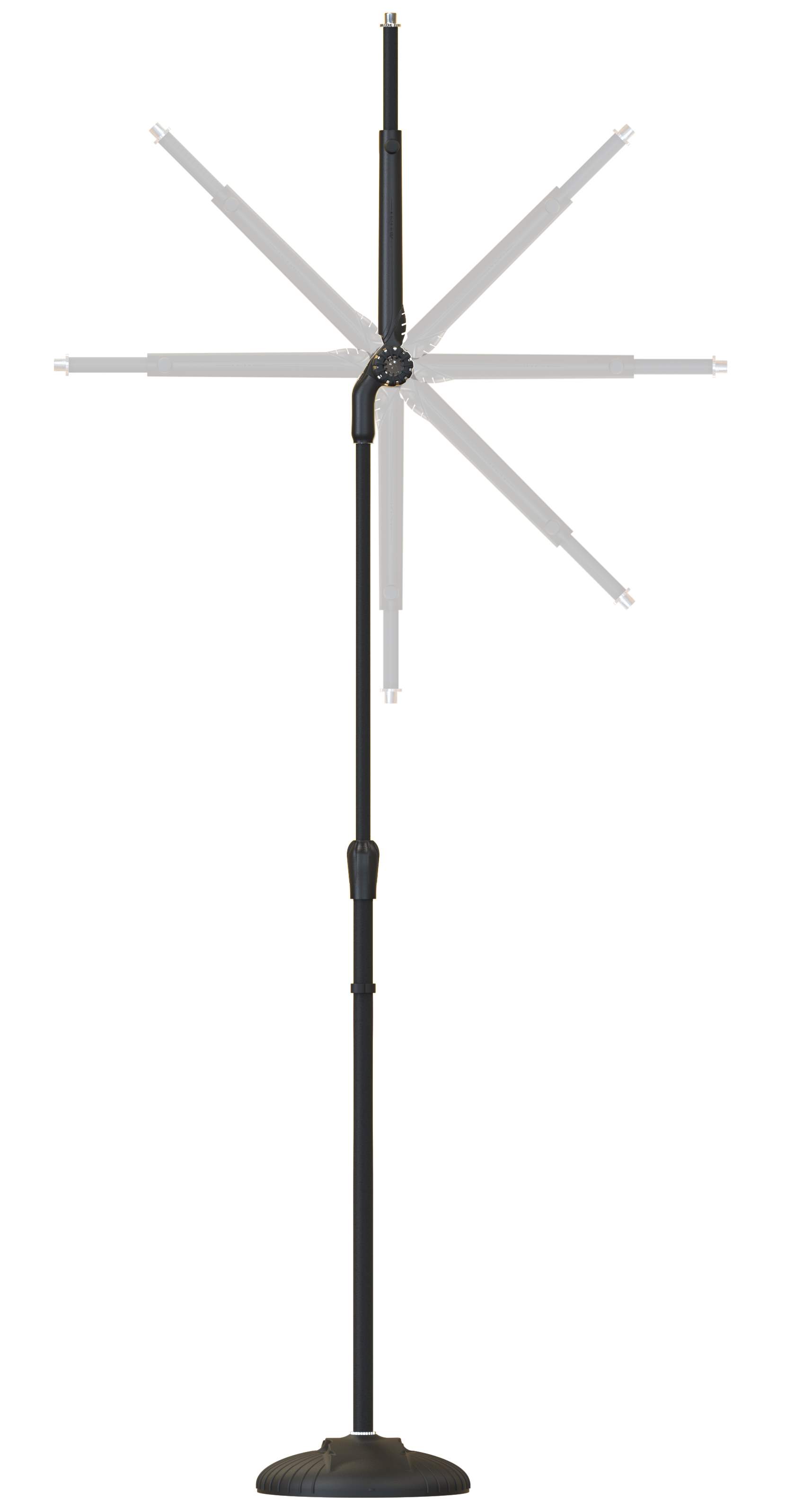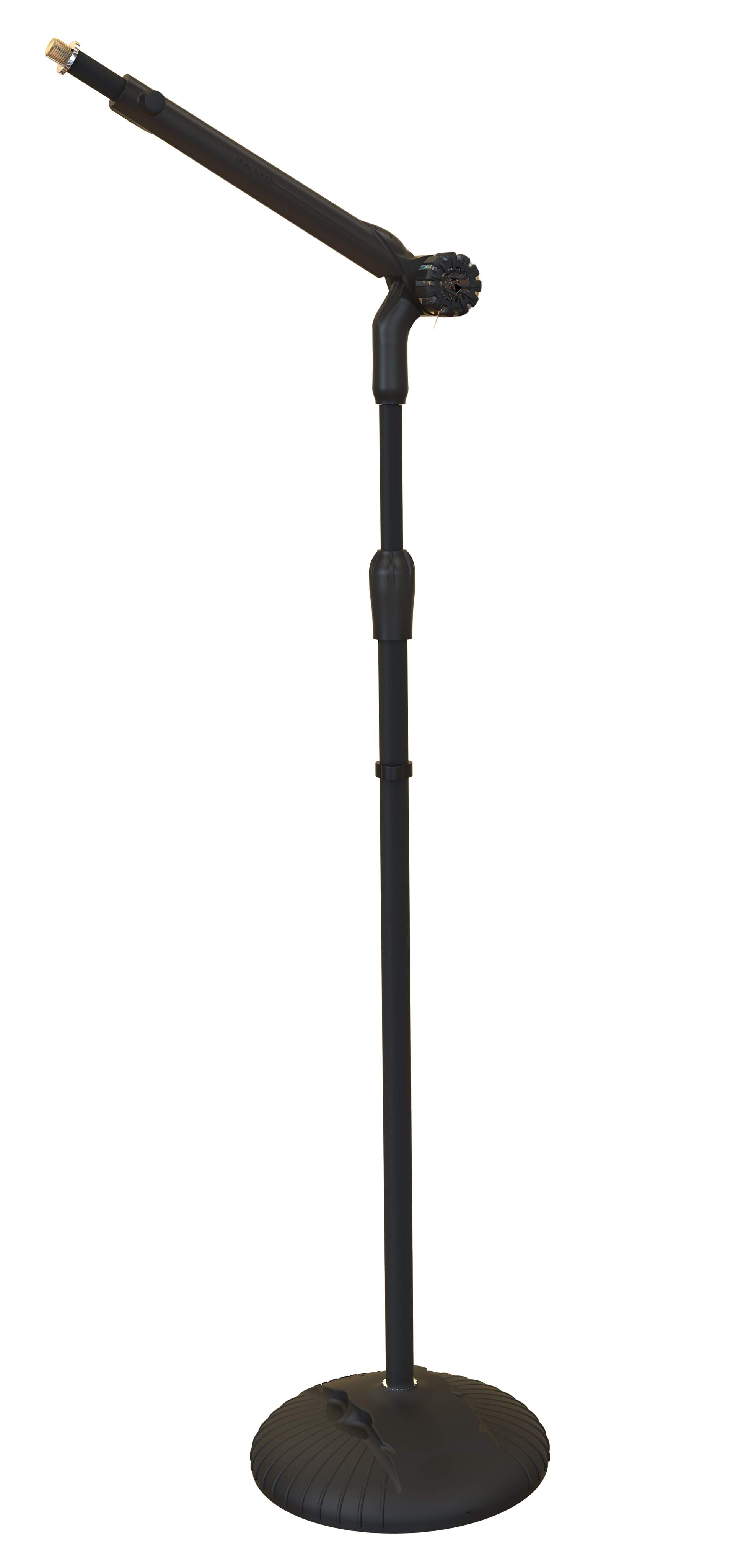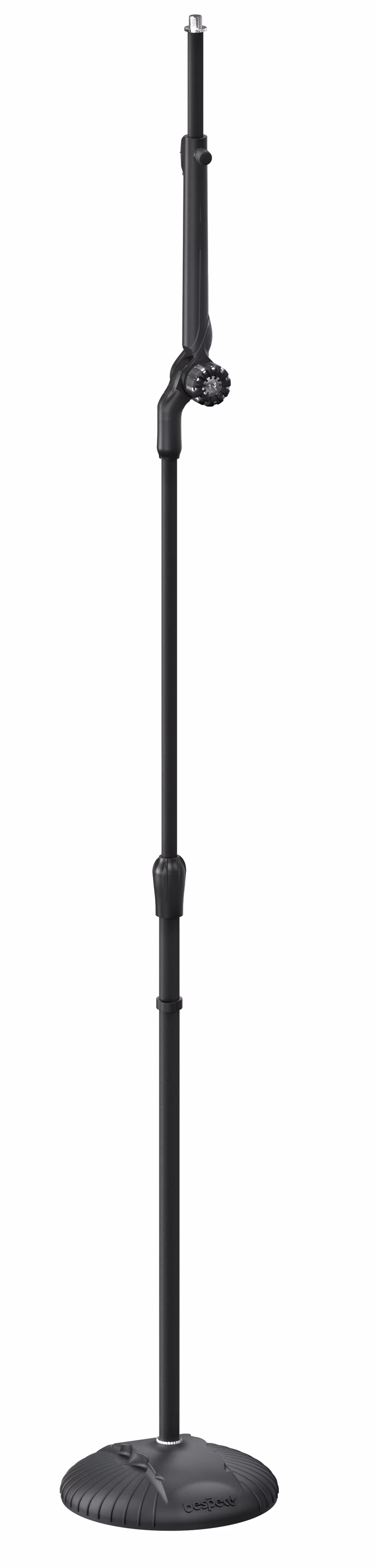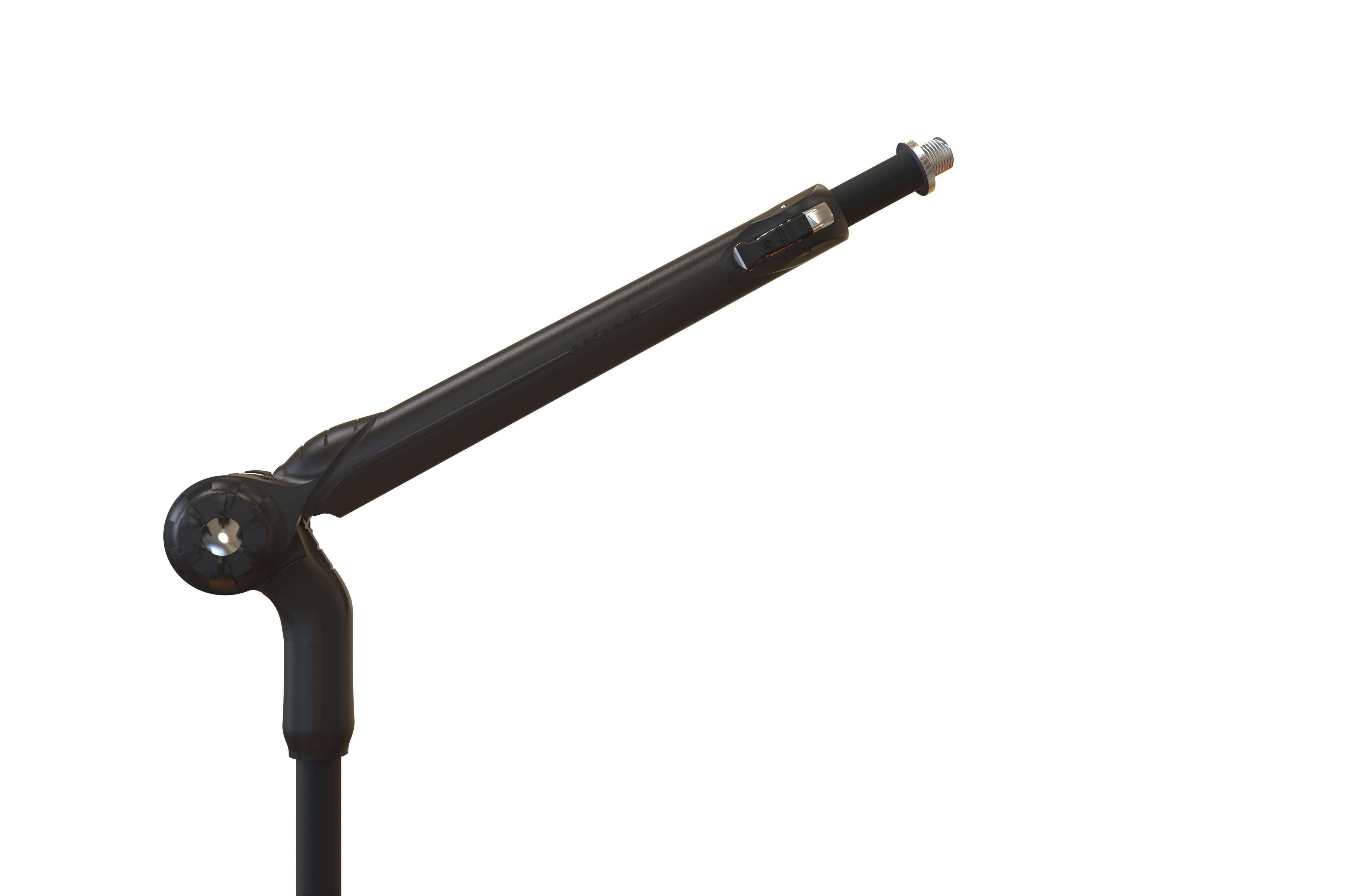 Zwei-in-Eins-Mikrofonständer. Das zentrale Gelenk kann um 270° gedreht werden, so dass der Ständer sowohl als gerader Ständer als auch als Ständer mit Teleskoparm funktioniert. Diese Konstruktion macht ihn sehr flexibel in Bezug auf den Raum. Das zentrale Gelenk ist aus einer Aluminiumlegierung gefertigt und lässt sich dank der gummierten Beschichtung leicht festziehen. Die Länge der Teleskopstange wird durch einen selbstschließenden Mechanismus mit Sicherheitsverschluss mit einem einzigen Druck eingestellt. Oberhalb des Mittelstücks befindet sich ein Platz für die Plektren.