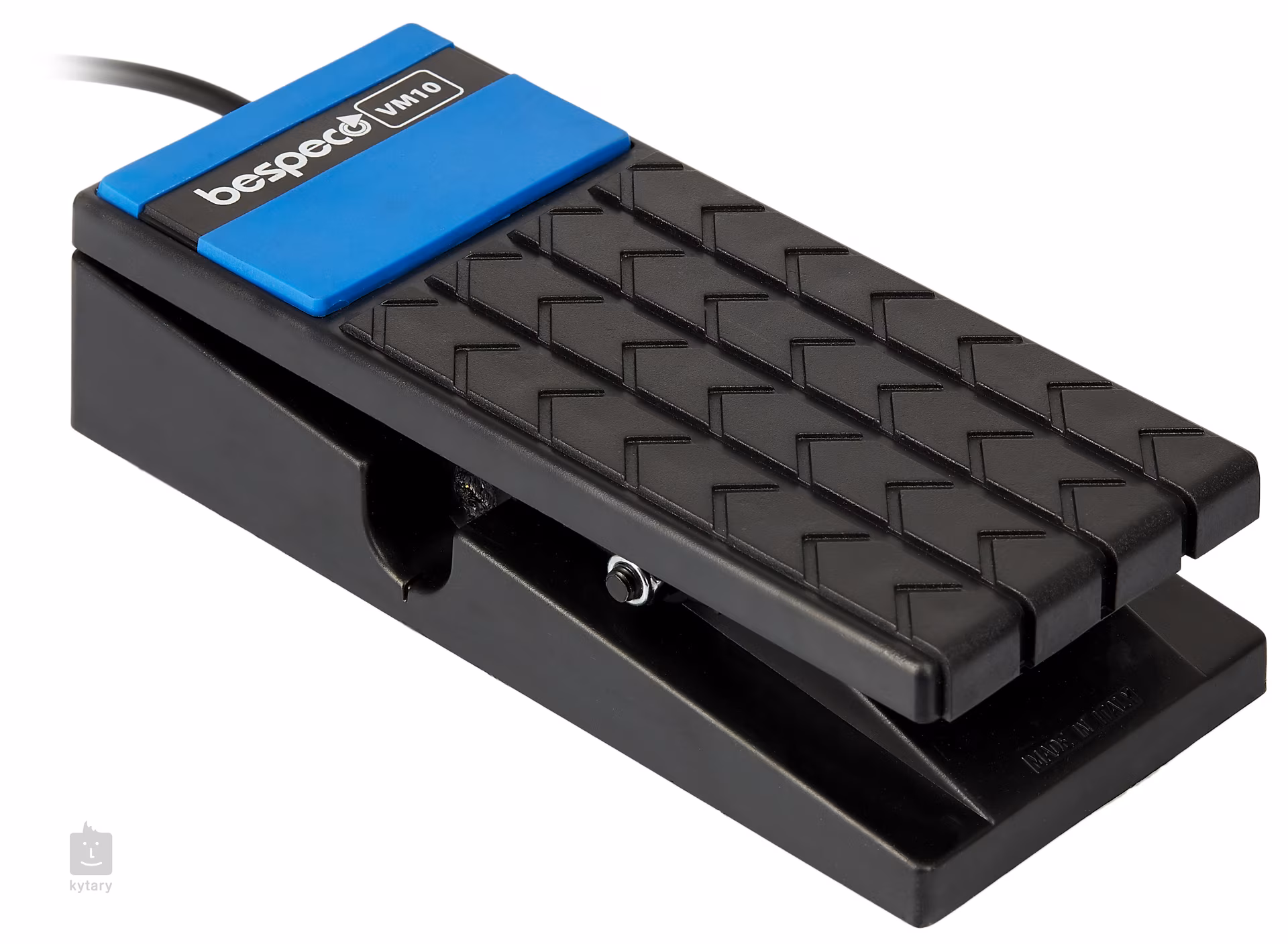 Lautstärkepedal der italienischen Firma Bespeco mit Kabel (Länge 2 m) und 6,3 mm Ausgangsbuchse zum Anschluss an einen Verstärker. Es besteht aus einer Kombination aus haltbarem ABS-Kunststoff und abgeschirmter Stahlbasis mit gummierten Füßen. Die Impedanz beträgt 100 Kohm.