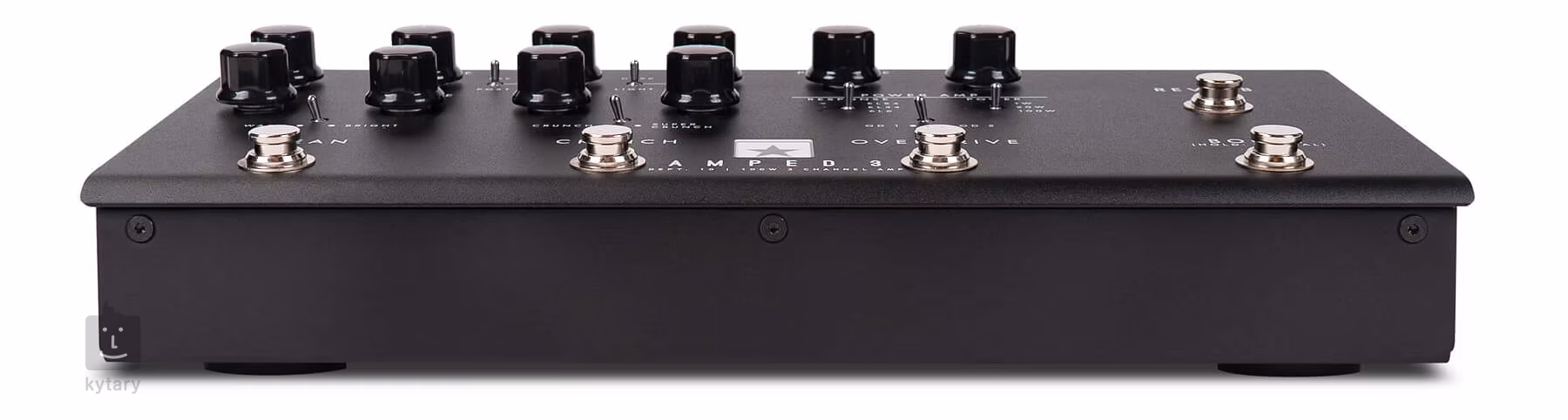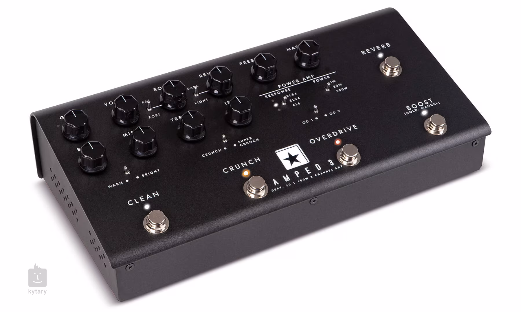 Es ist eine digitale Maschine mit einem Class-D-Transistor-Ende, drei Kanälen (Clean, Crunch und Overdrive) mit jeweils zwei schaltbaren Voicings, einer separaten Booster-Sektion, die vor oder nach dem Preamp platziert werden kann, d.h. Sie können den Sound weiter sättigen oder sauber verstärken, schaltbare Ansprache durch Emulation der Endröhren (EL84, EL34, 6L6), professionelle Anschlussmöglichkeiten (USB-C, XLR DI), CabRig DSP-Lautsprechersimulator, der den Klang und das Gefühl der Mikrofone des gevoiceten Lautsprechers erstaunlich detailliert einfängt (Architect Editing Software im Lieferumfang), ein eingebauter Halleffekt mit zwei Dark- und Light-Mods und die gewohnten Regler für Gitarrenverstärker (plus eine patentierte ISF-Funktion, mit der du zwischen einem britischen und einem amerikanischen Sound wählen kannst).