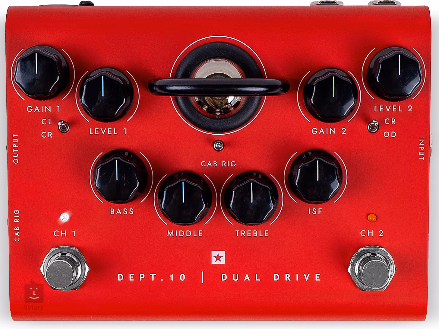 Dept. 10 Dual Drive ist ein zweikanaliger Overdrive-Effekt mit vier verschiedenen Voicings (Clean und Crunch 1 auf dem ersten Kanal, Crunch 2 und Overdrive auf dem zweiten Kanal), einem Dreiband-EQ und einer patentierten ISF-Schaltung (die es ermöglicht, zwischen dem amerikanischen und dem britischen Klangcharakter zu wechseln), USB-Schnittstelle mit ultraniedriger Latenz für Aufnahmen, XLR-DI-Ausgang als Lösung für Live-Auftritte, eine Effektschleife für die einfache Integration in jedes Pedalboard und eine neu entwickelte Cab Rig DSP-Lautsprechersimulation, die den Sound und das Feeling von professionell abgestimmten Gitarrenlautsprechern reproduzieren kann. Weitergehende Bearbeitungsmöglichkeiten der Cab Rig DSP-Simulation (Cabs, Mikrofone, Mikrofonpositionen, virtuelle Räume) bietet die Architect-Software, die kostenlos heruntergeladen werden kann.