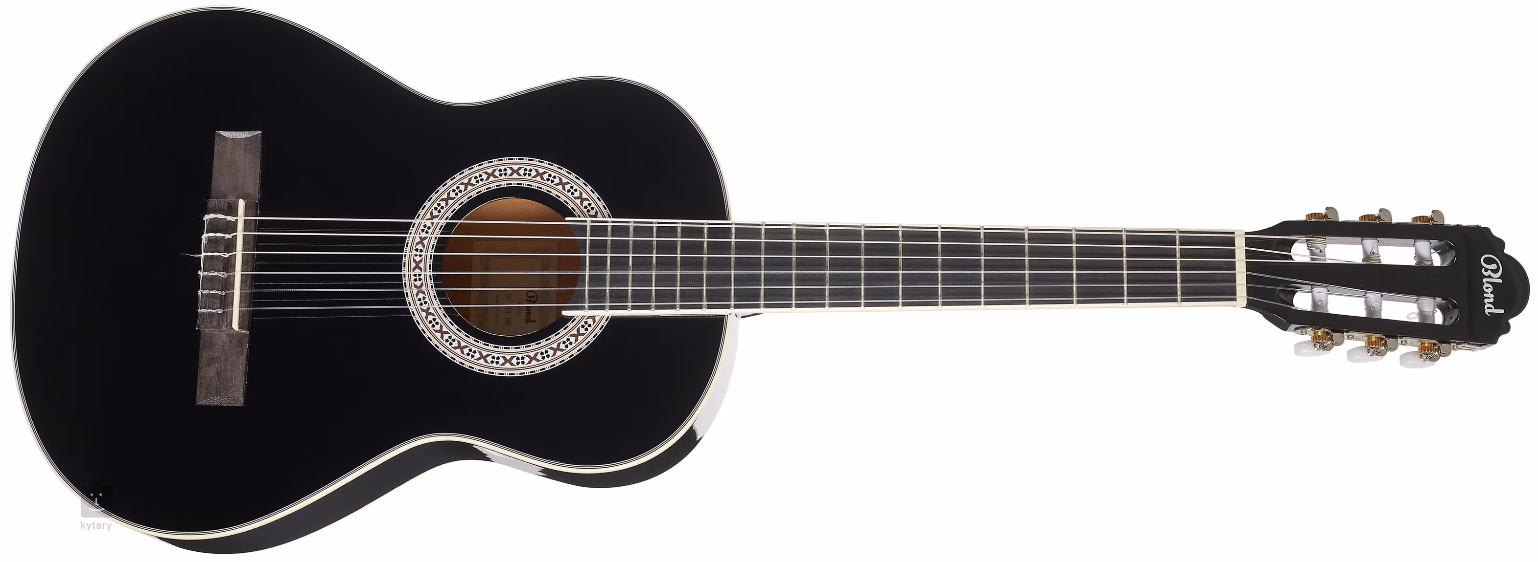 Die Blond OC-34 BK Kinder-Klassikgitarre in 3/4 Größe hat einen Korpus aus laminierter Fichte und Linde, einen Hals aus Okoumé-Holz und ein Griffbrett und eine Kopfplatte aus modernem Verbundmaterial. Die Saiten sind in klassischen verchromten Mechaniken mit weißen Wirbeln über einem Kunststoff-Nullbund aufgezogen. Das stilvolle Finish wird durch den aufgetragenen Glanzlack, die schwarze Lackierung des Resonanzbodens und die traditionellen Elemente in Form einer dekorativen Rosette und einer Kunststoffzierleiste (ABS) unterstrichen.
