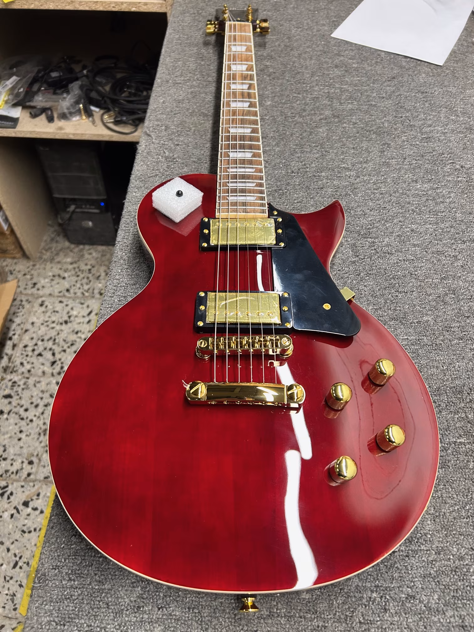 Zwei Humbucker mit Alnico-V-Magneten verleihen der Gitarre einen schön satten, vollen Klang, den Sie beim Rock und anderen Musikstilen zu schätzen wissen werden. Seinen Charakter/Klang können Sie mit den Lautstärkereglern, dem Tonregler und dem dreistufigen Pickup-Schalter einstellen. Die Saiten sind in den firmeneigenen Stimmmechaniken und über einen festen Steg im Saitenhalter befestigt. Die stilvolle Verarbeitung wird durch das Pickguard und die Hardware in Goldoptik unterstrichen.