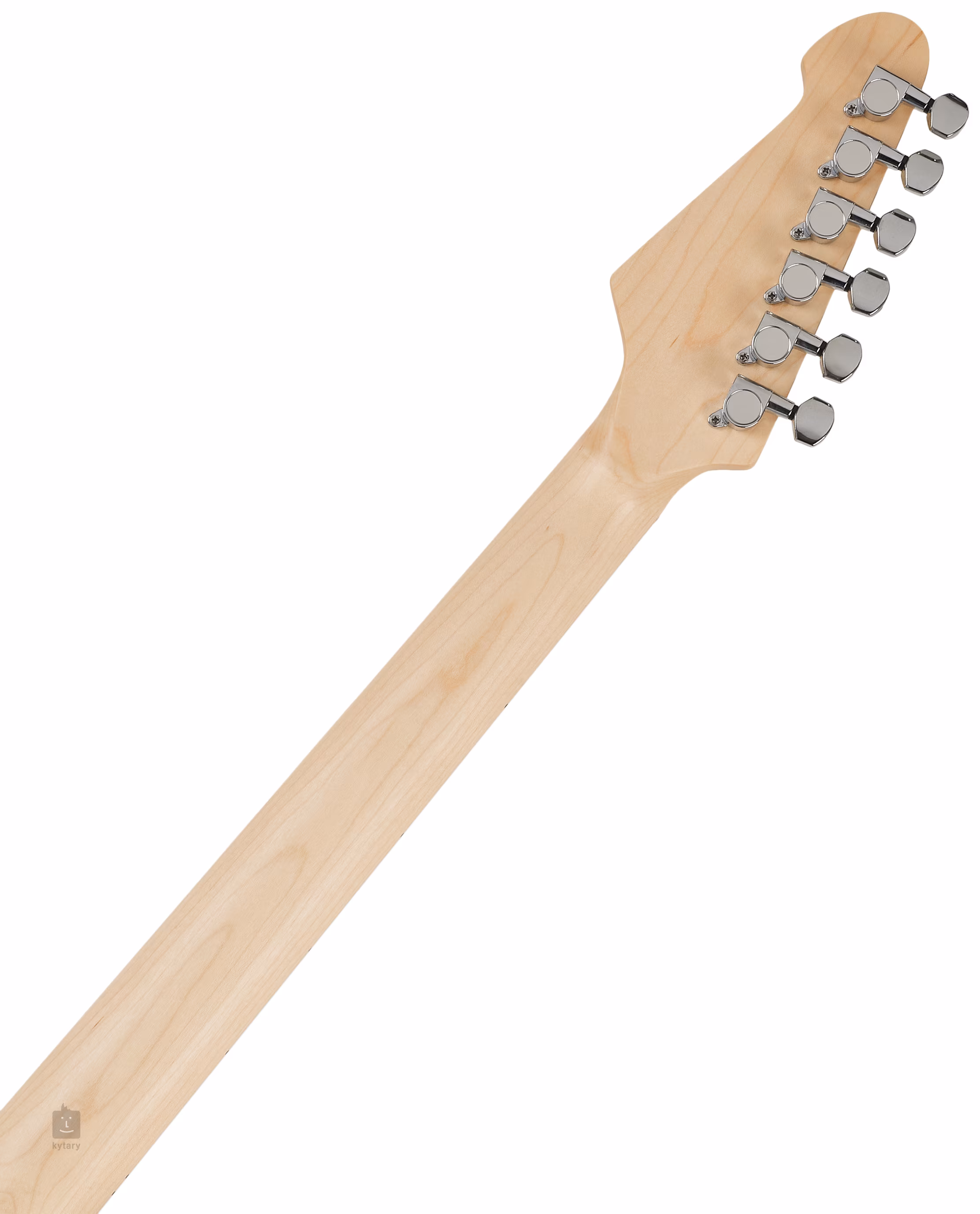 Der Korpus der Gitarre ist aus Pappelholz gefertigt. Der Ahornhals bietet ein angenehmes Modern-C-Profil, und das Griffbrett ist durch zweiundzwanzig Bünde unterteilt. Drei Singlecoil-Tonabnehmer verleihen der Gitarre den klassischen, treibenden Sound der ST-Modelle. Sein Charakter lässt sich mit den Reglern für Tonblende, Lautstärke und Pickup-Schalter einstellen.