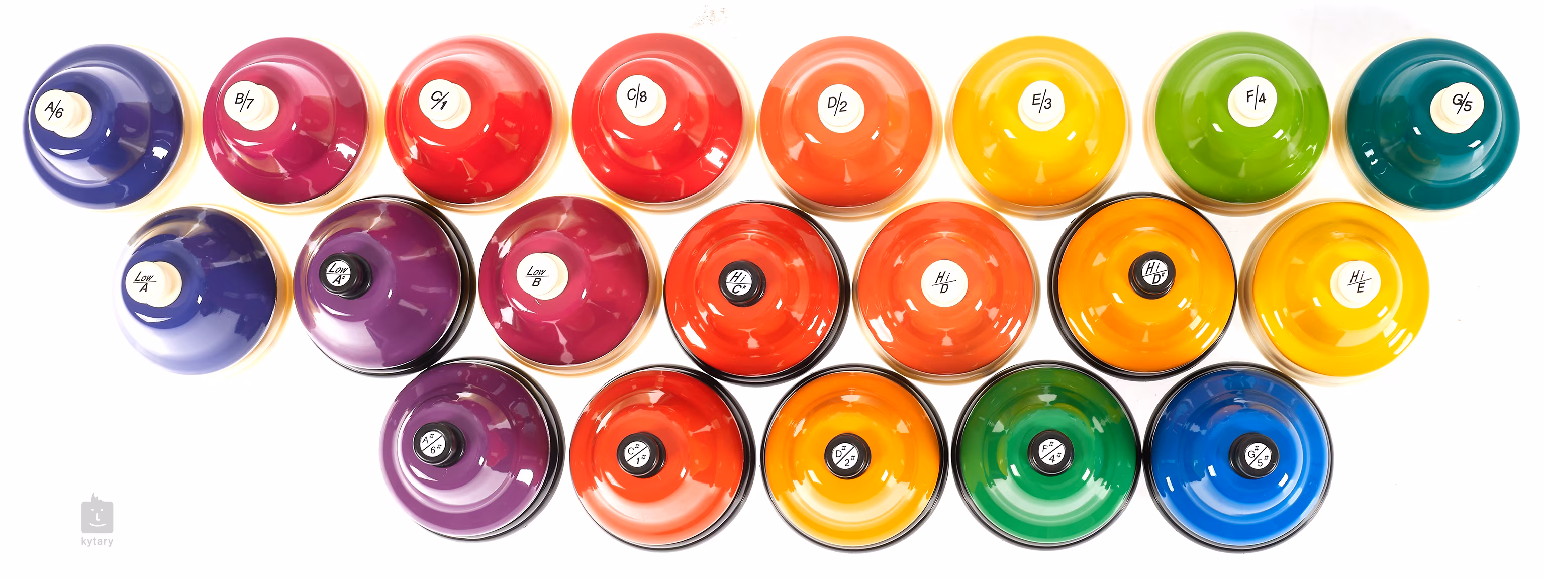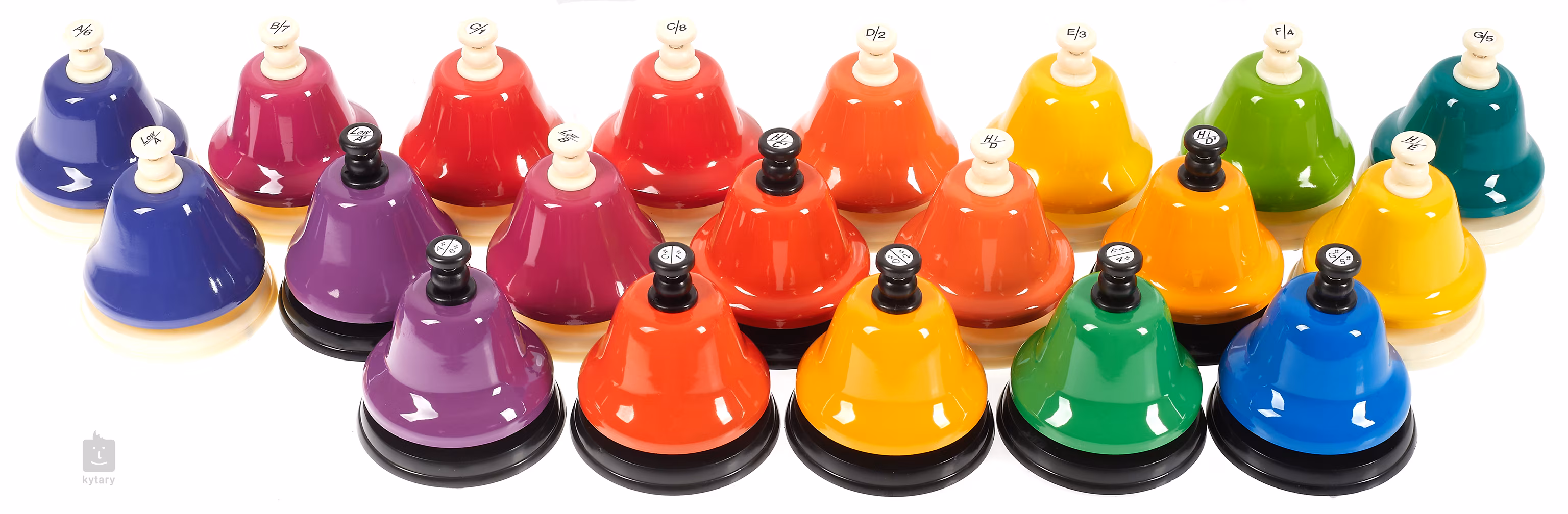 Dieses komplette Set mit zwanzig Glöckchen enthält Glöckchen mit Tönen von tiefem A bis hohem E. Es besteht aus einem diatonischen Set (CNDB-D), einem chromatischen Set (CNDB-C) und einem Erweiterungsset (CNDB-EX).