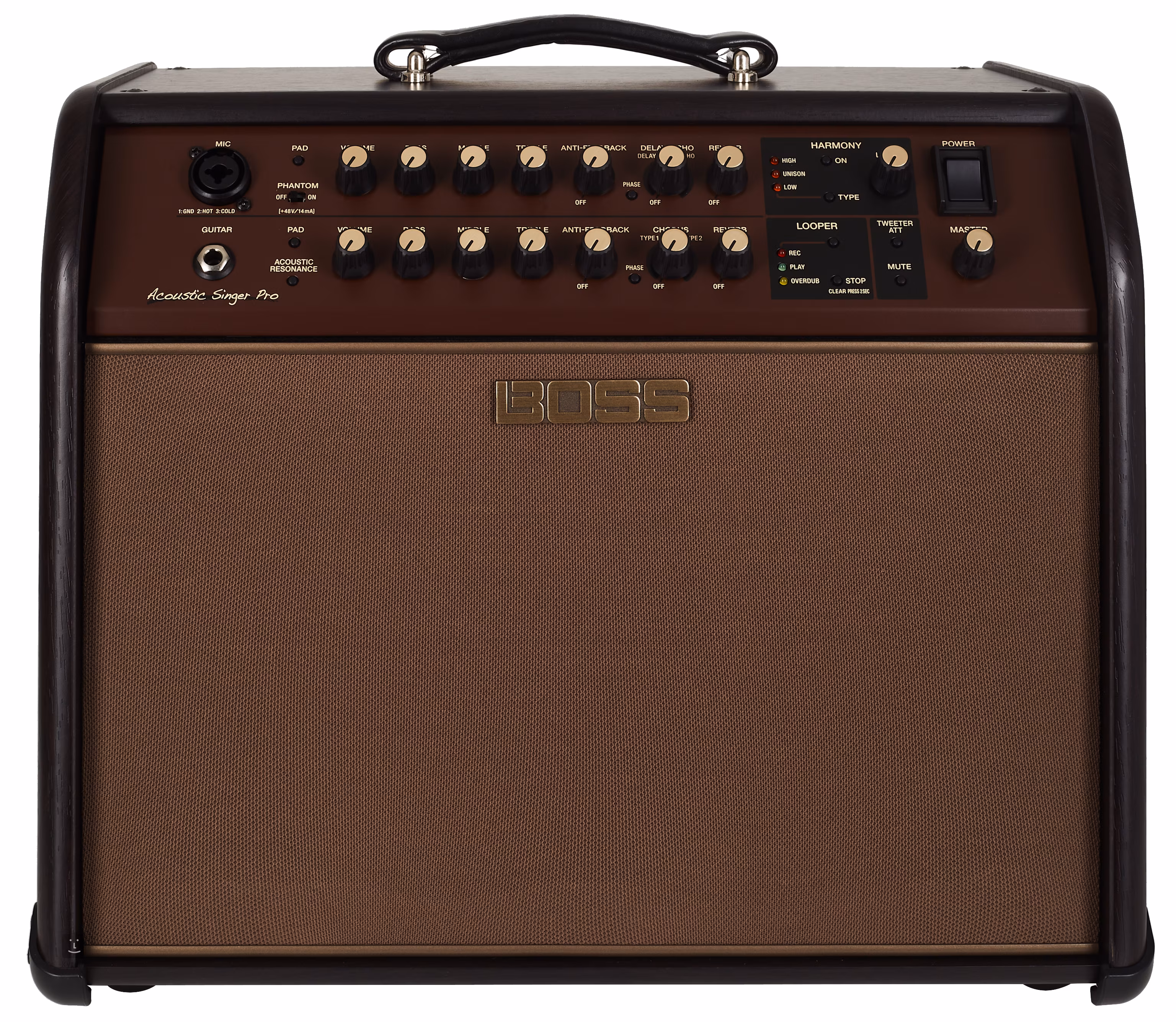 Die Combos der Acoustic Singer-Serie sind in erster Linie für Singer-Songwriter mit Gitarre oder anderen akustischen Instrumenten konzipiert und bieten alles, was sie für einen hochwertigen Auftritt benötigen. Beide Kanäle verfügen über Dreiband-EQ, Rückkopplungsschutz und Hall. Sie können Ihren Gitarrensound mit zwei Arten von Chorus, Vocals mit Delay und Echo verbessern. Eine interessante Neuerung bietet die Harmonie-Funktion, die automatisch Gesangsharmonien im nächstgelegenen geeigneten Intervall auf der Grundlage der Akkord-/Tonleiteranalyse des Gitarreninputs erzeugt - zwei Arten von Harmonien sind verfügbar (aufwärts und abwärts), sowie ein Vokalverdopplungseffekt im Unisono. Zu allem Überfluss verfügt der Combo auch noch über einen eingebauten Looper mit Fußschaltersteuerung und eine USB-Schnittstelle zum Übertragen auf einen Computer. Über zwei XLR-Anschlüsse auf der Rückseite können Sie jeden Kanal separat (vor oder nach den Effekten) oder die gesamte Mischung ausgeben.