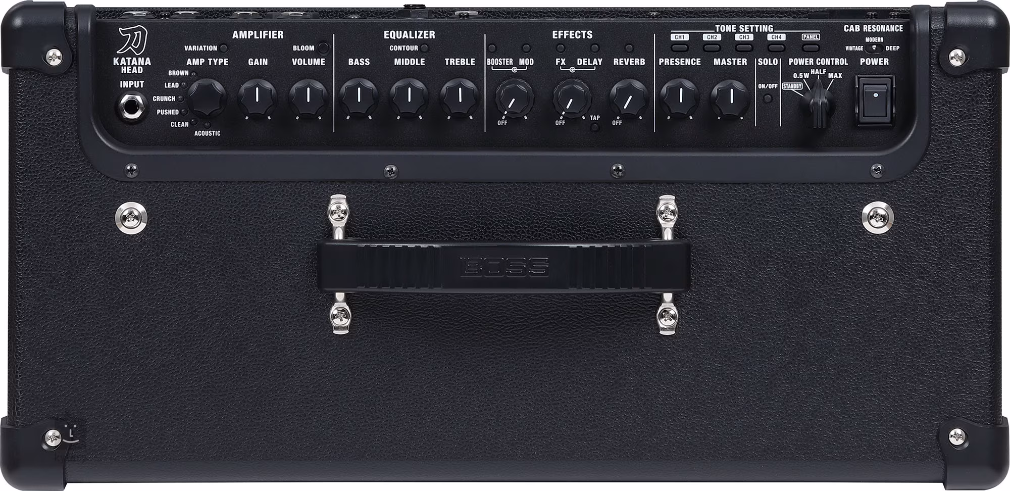 Amp Type, Gain, Volume, Bass, Middle, Treble, Booster/Mod, FX/Delay, Reverb, Resonance, Master, Power Control (Standby, 0,5 W, Half, Full), Tone Setting (CH1, CH2, CH3, CH4, Panel), Variation, Bloom, Contour, Cab Resonance (Vintage, Modern, Deep), Solo On