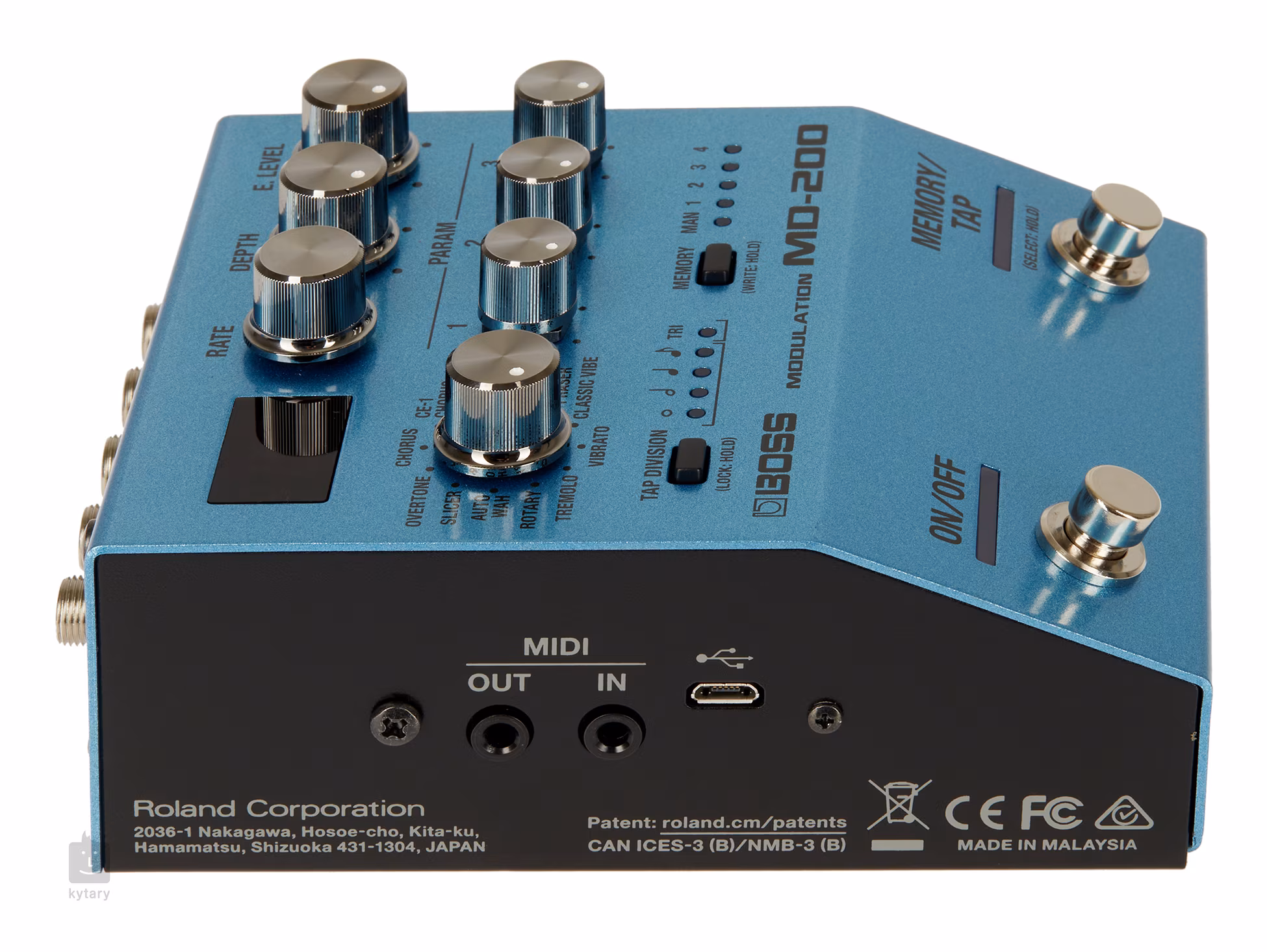 Im Falle des MD-200-Effekts werden Sie die Multifunktions-Fußschalter zu schätzen wissen, mit denen Sie nicht nur den Effekt aus- und einschalten können, sondern auch eine Tap-Tempo-Funktion (mit rhythmischen Unterteilungen in Intervallen von ganzen, halben, viertel, achtel Noten und deren Variationen in Triolen) und die Möglichkeit haben, zwischen vier internen Speichern umzuschalten, in denen Sie Ihre Lieblingspresets ganz einfach speichern und dann wieder abrufen können.