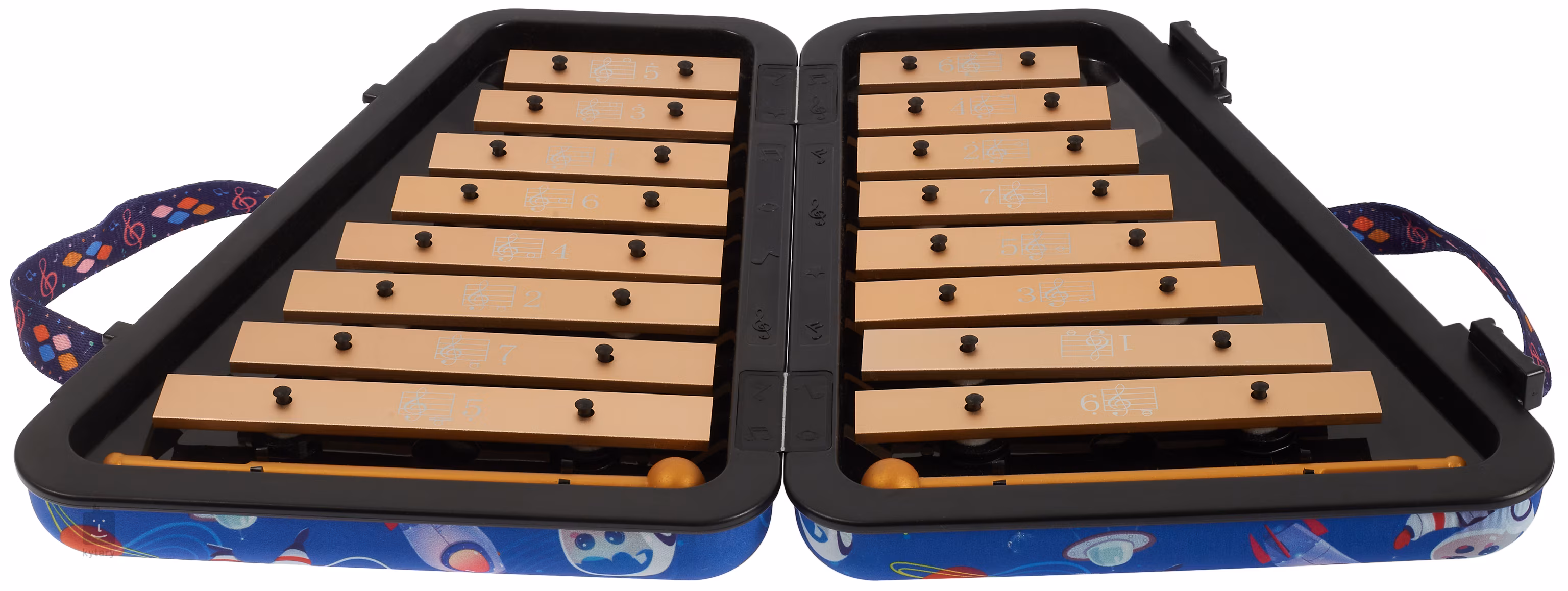Ein schickes Xylophon aus der CX-Serie von Byla. Es ist aus Aluminium gefertigt und geschickt in eine Tragetasche eingepasst, so dass man es einfach auspacken und losspielen kann. Ein Paar Drumsticks ist natürlich im Lieferumfang enthalten, und in der Verpackung ist auch noch Platz dafür.
