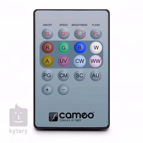 Die kompakte IR-Fernbedienung Q-Spot Remote 2 dient zur Fernsteuerung der Leuchten der Q-Spot-Serie von Cameo. Mit ihr kann man zwischen den Grundfarben (R, G, B, W, A, CW und WW) umschalten, die Programmgeschwindigkeit einstellen, die Helligkeit verändern oder die Blitzfunktion aktivieren.