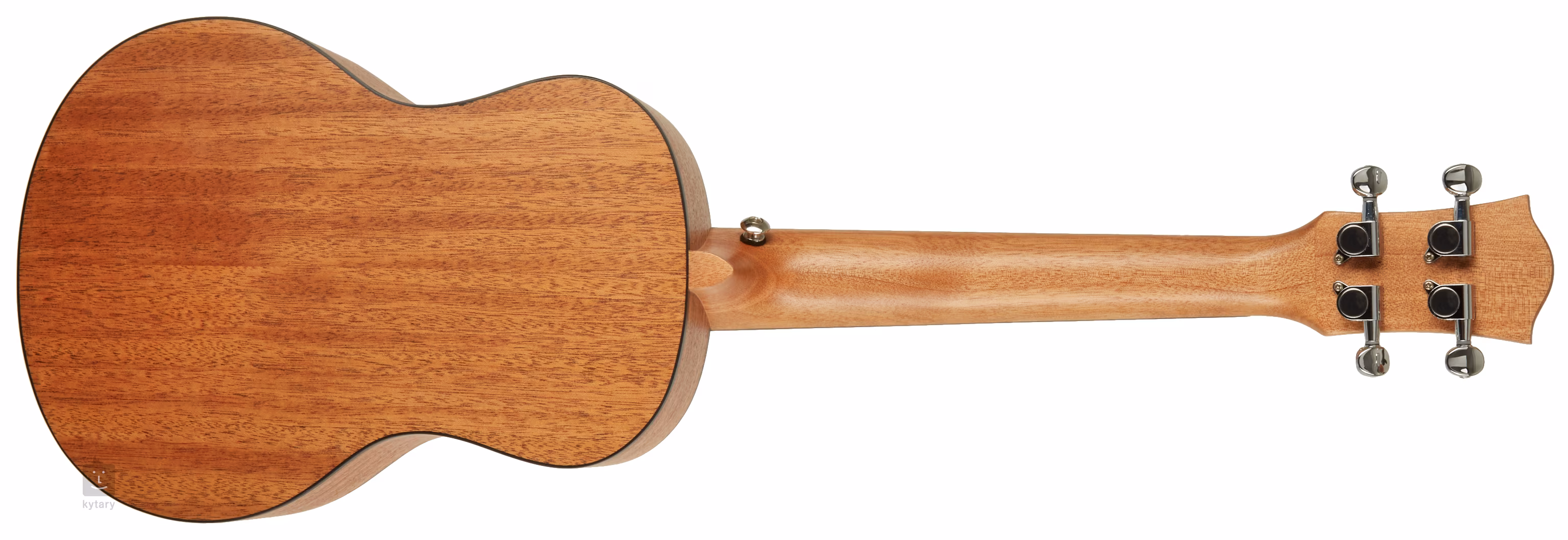 Die Saiten sind in verchromten gitarrenähnlichen Mechaniken und einem Griffbrett aus Palisander montiert. Die schöne Verarbeitung wird durch die Rosette und die Tabulatur mit Fischgrätenmuster und die schwarze, beidseitig umlaufende Korpuseinfassung unterstrichen. Die Ukulele wird in einem gepolsterten Koffer (Polsterstärke 5 mm) mit drei Plektren geliefert.