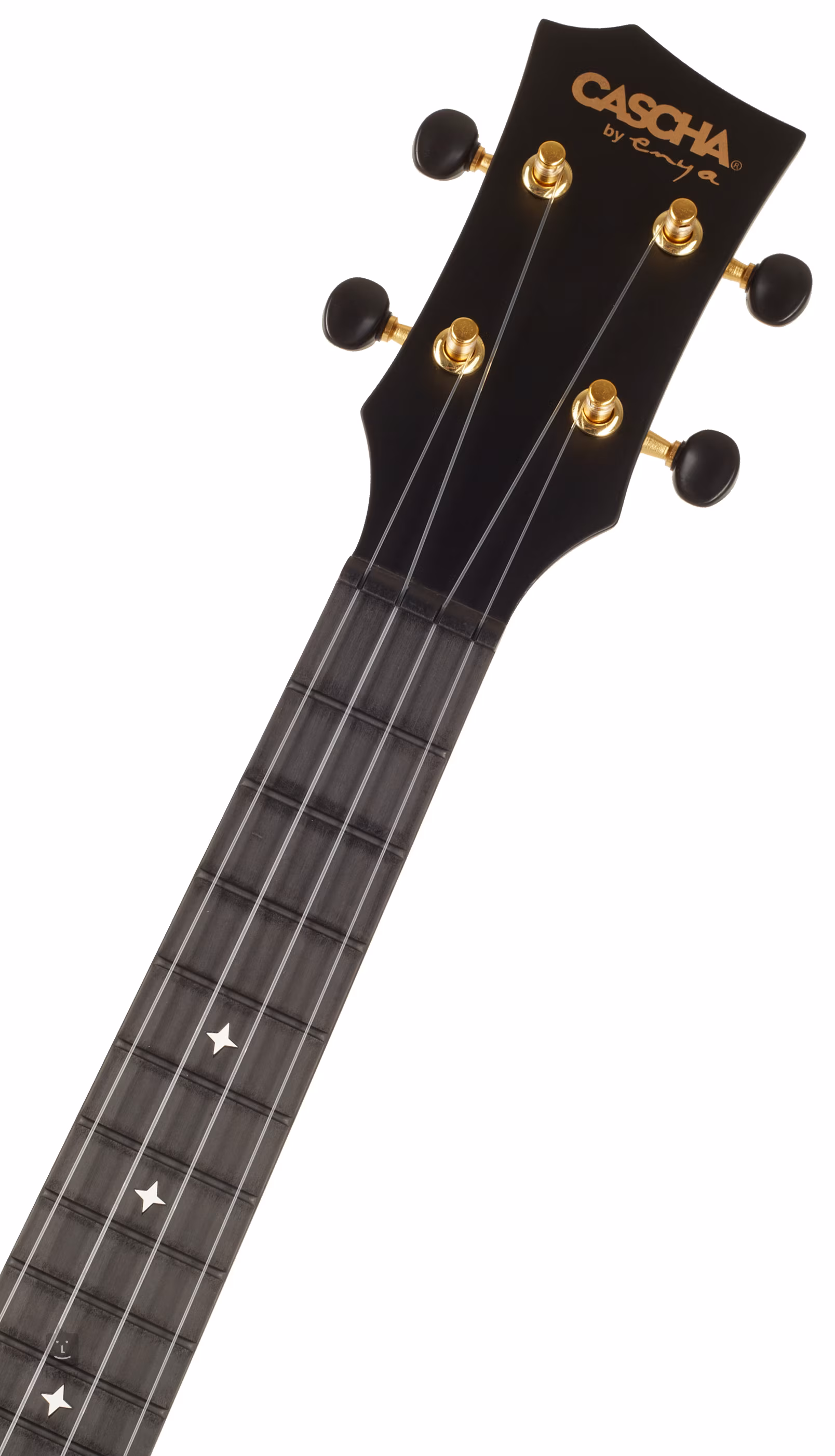 Diese Cascha Konzert-Ukulele ist vom Korpus bis zur Kopfplatte aus kohlefaserverstärktem Kunststoff (Polycarbonat) gefertigt. Dadurch bietet sie auch bei geringem Gewicht eine hohe Widerstandsfähigkeit gegen äußere Einflüsse und Beschädigungen - und einen anderen, klareren Klang im Vergleich zu herkömmlichen Holz-Ukulelen (dazu trägt auch das zusätzliche seitliche Schallloch bei). Das moderne Design des Instruments mit einem tieferen Korpusausschnitt bietet eine gute Nachgiebigkeit des Griffbretts auch in höheren Lagen. Die gute Stimmung der Fluorocarbon-Saiten garantiert ihren Sitz in offenen gitarrenartigen Mechaniken.
